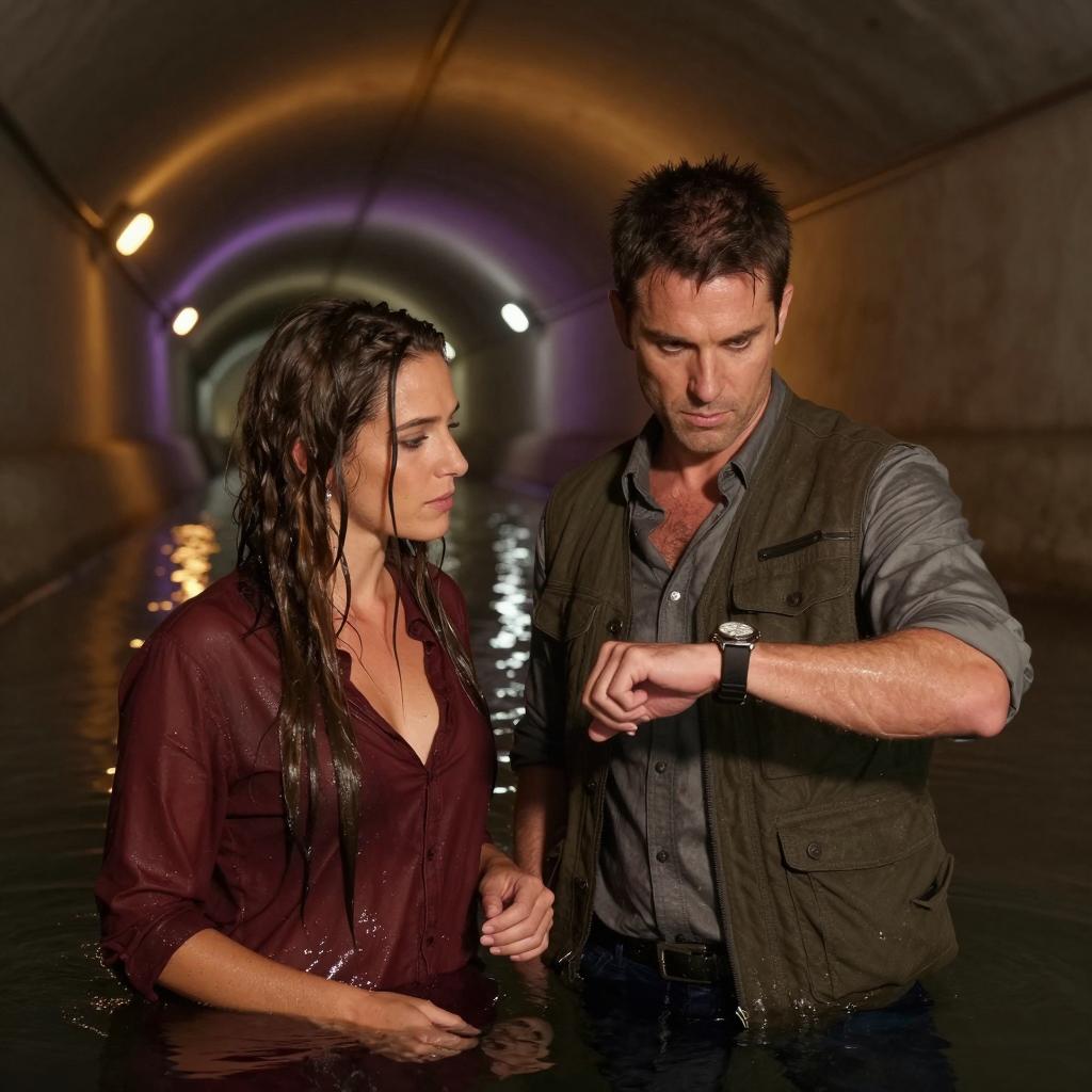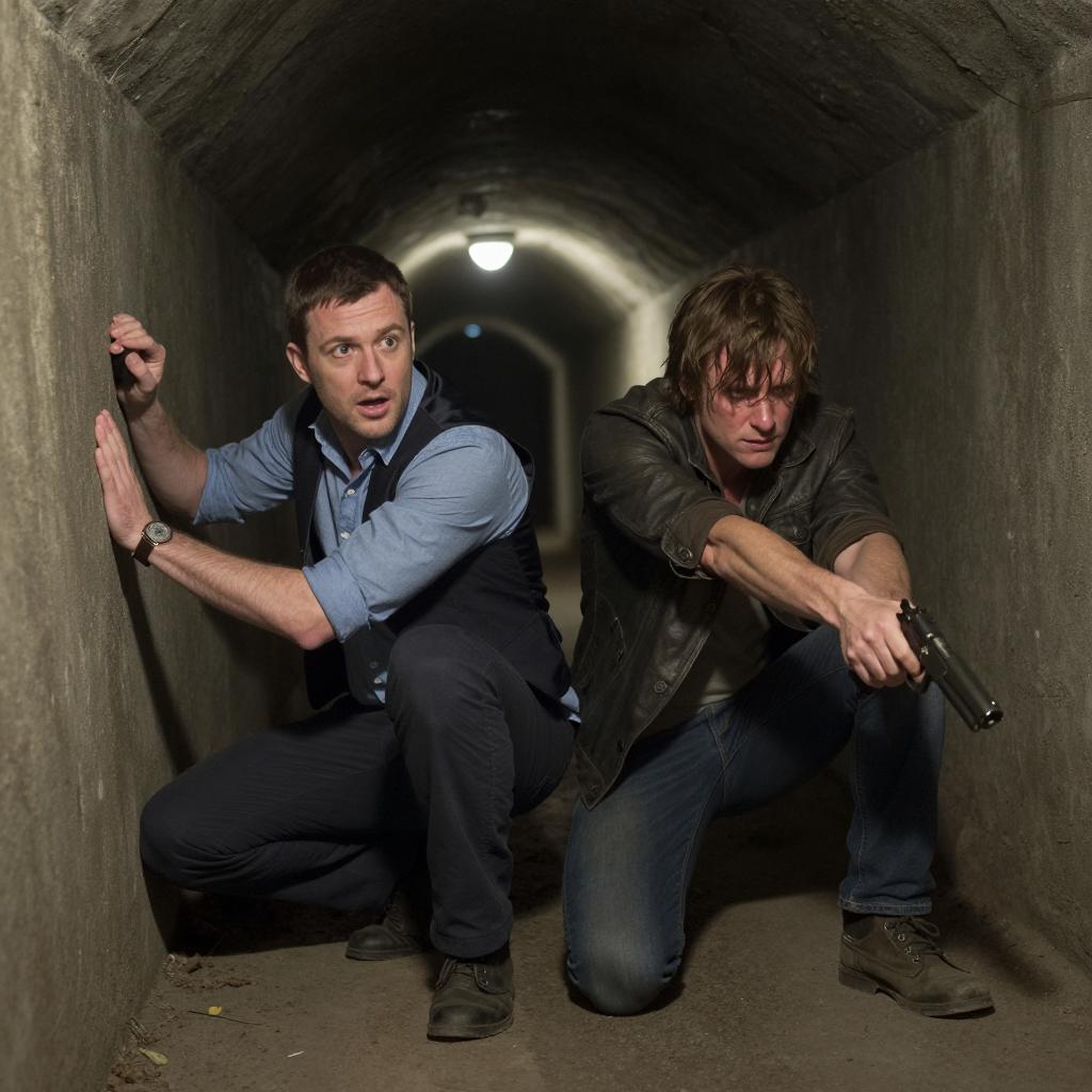 Two men in a dimly lit tunnel. The man on the left has short dark hair, wears a blue shirt and dark vest, looks surprised. The man on the right has messy brown hair, holds a gun, looks determined. Both men are in tense, low crouched positions. The man on the right is slightly behind the man on the left. The tunnel walls are rough and dark. The man on the right's gun is pointed forward. The man on the left's hand grips a dark object on the left wall.