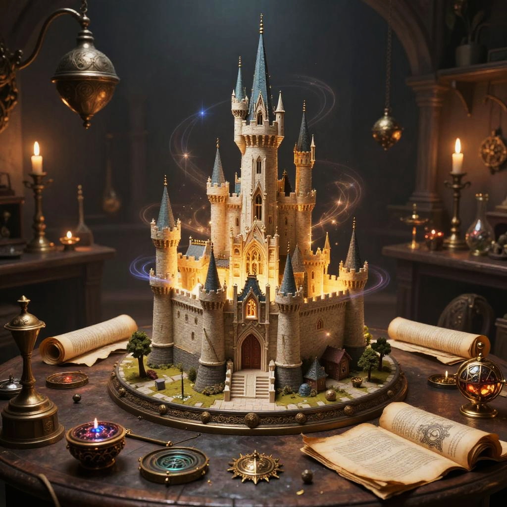 Photograph of a glowing, detailed fantasy castle with blue-tipped spires, surrounded by candles, ancient scrolls, magical orbs, and brass instruments in
