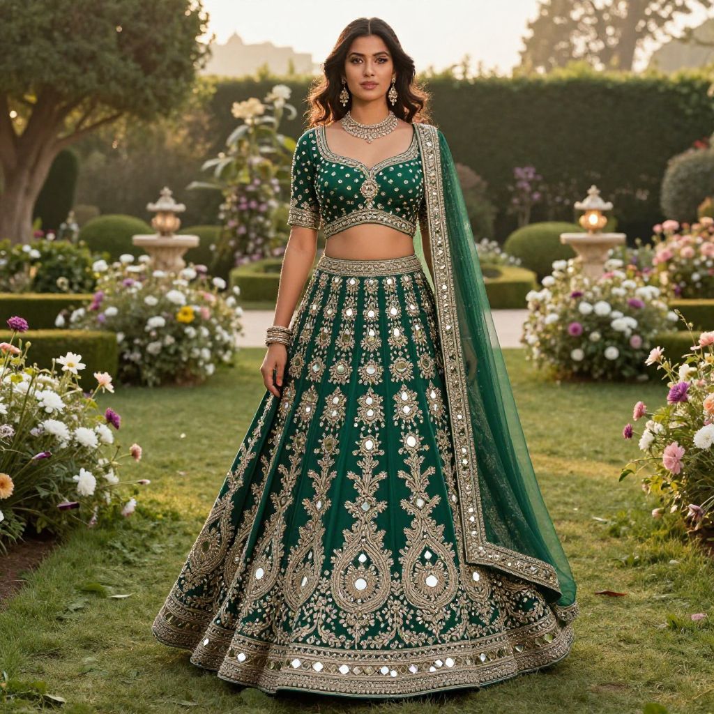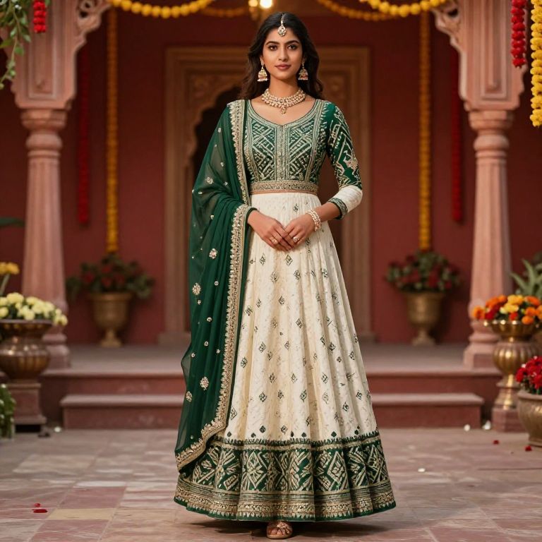 Prompt salwar kameez with subtle geometric patterns in deep emerald and cream, styled for a wedding ceremony, set in a traditional Indian courtyard with red and gold decorations, soft ambient lighting, culturally authentic, high detail, cinematic composition.