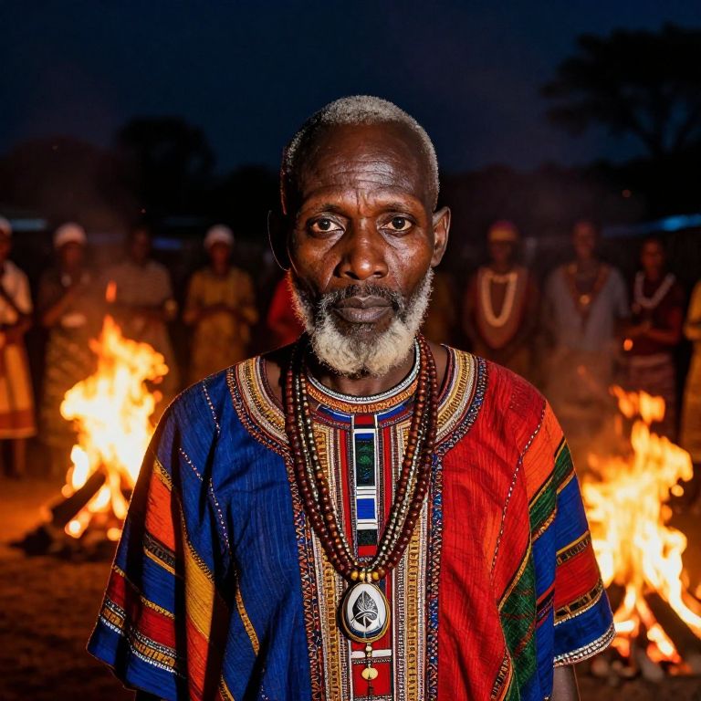 Envision a photorealistic portrait of an African tribal chief with captivating deep eyes and a distinguished beard, illuminated by the dancing light of a bonfire in his village. Captured from above, this image showcases both the intensity of his gaze and the vibrant hues of his traditional clothing. The scene exudes warmth, pride, and resilience as he stands tall before his people, his powerful presence mirroring the flames that flicker around him in the night.