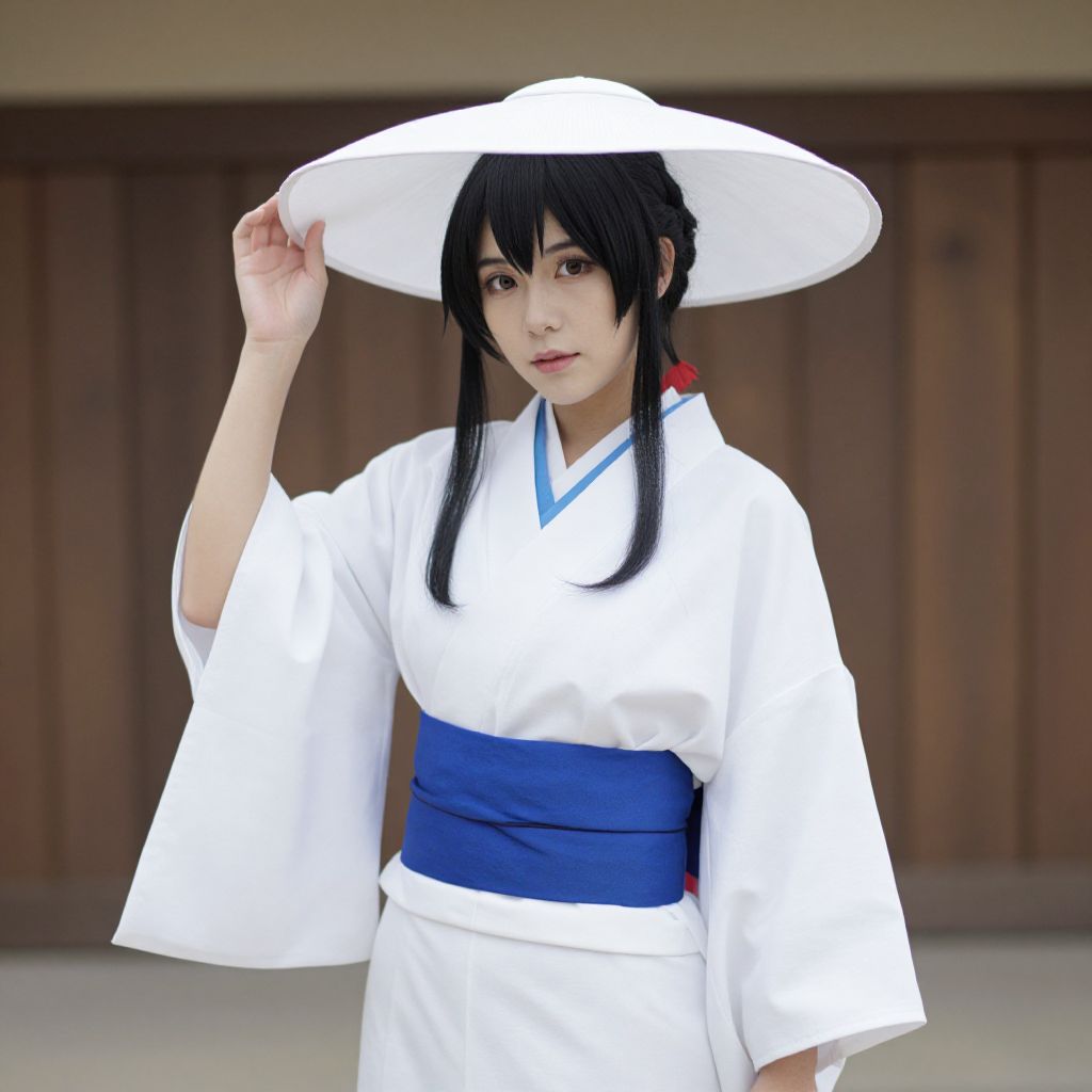 "Yubaba Spirited Away Cosplay, woman in a white kimono with a hat and a blue sash"
