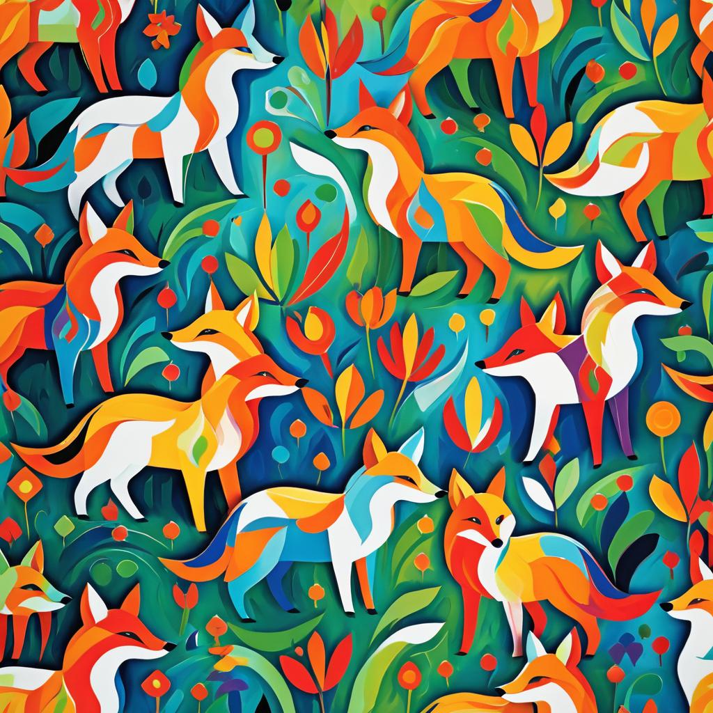Vibrant abstract pattern featuring multiple stylized foxes in orange, white, and red tones surrounded by colorful floral and leafy elements on a gradient blue-green background.