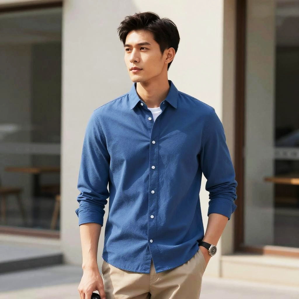 Young Man in Blue Shirt Smart Casual Style
