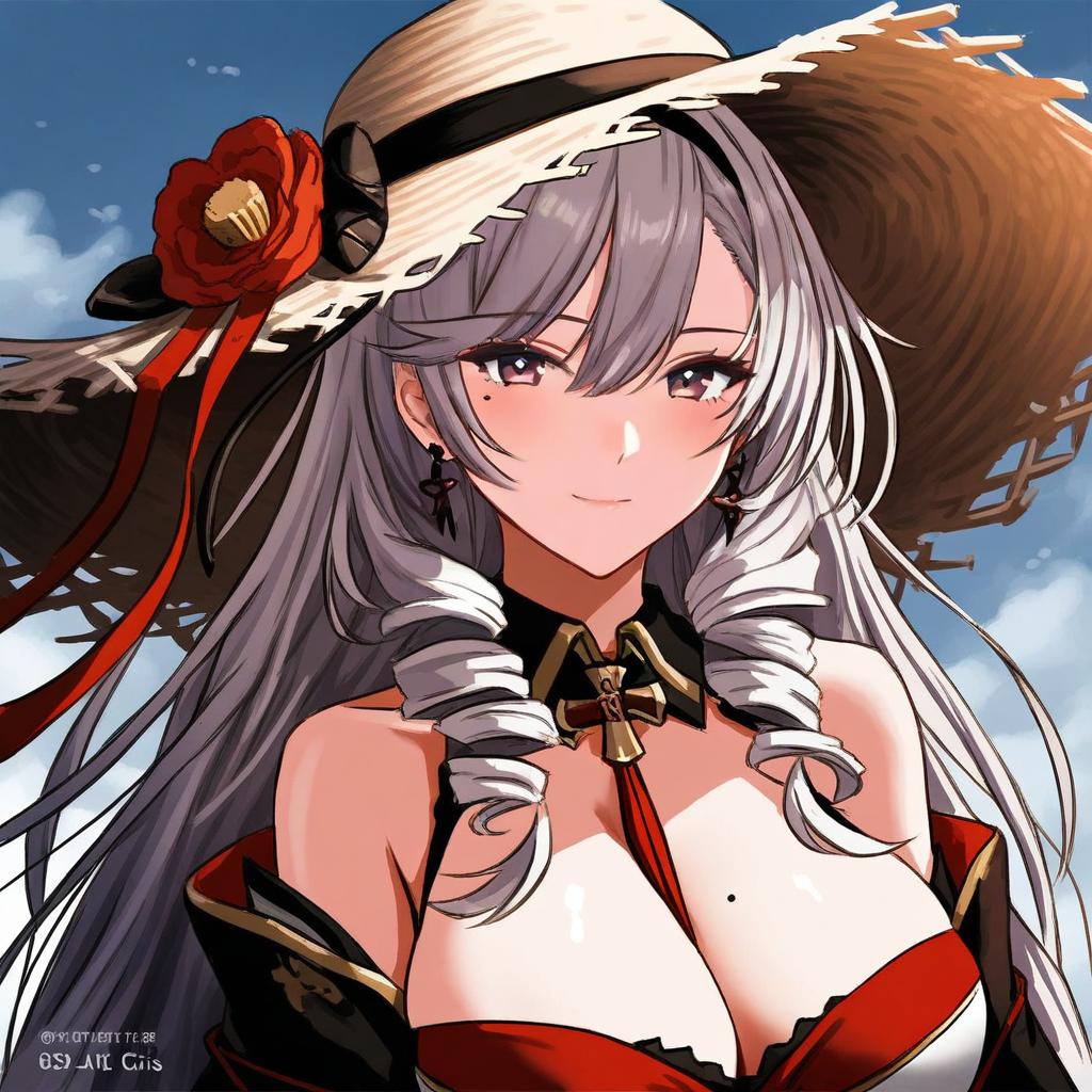 Portrait of an anime-style female character with very long two-tone gray and white hair styled in twin drills. She has purple eyes, a mole under one eye and another on her chest. The character is wearing a large straw hat with a red flower and ribbon, a two-tone white and red bikini, and black and gold outerwear with bare shoulders. The background features a blue sky with some clouds. The art style is detailed and vibrant, influenced by anime and digital illustration trends.