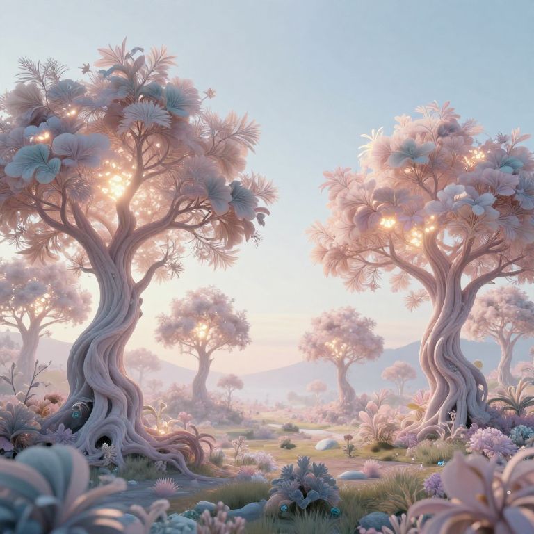 Stable diffusion AI image showing a serene landscape blending digital and natural elements, AI-generated fractal trees with luminous leaves, soft pastel color palette, surreal atmosphere, combining advanced technology and nature harmony, intricate textures, ethereal glow.