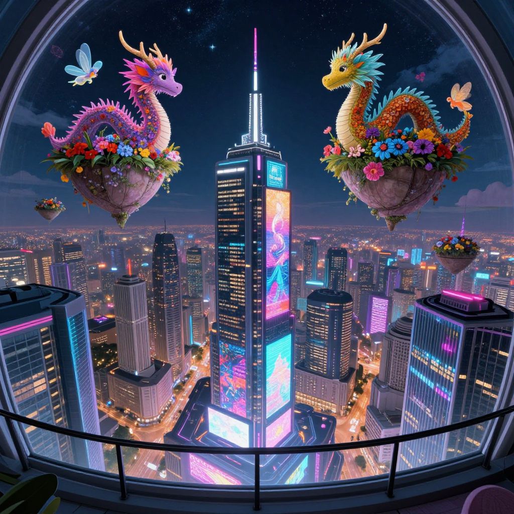 In this captivating vision of a futuristic metropolis, a high-contrast cityscape unfolds from an aerial perspective, teeming with vibrant geometric shapes in bold primary colors clashing against sleek glass buildings. A majestic golden dragon gracefully soars through the urban landscape, its iridescent scales reflecting the kaleidoscope of lights emanating from below. The dragon effortlessly weaves between towering skyscrapers and holographic advertisements, creating an emotionally charged dance that celebrates the fusion of ancient mythological elements with modern technology, evoking both awe and curiosity in equal measure.