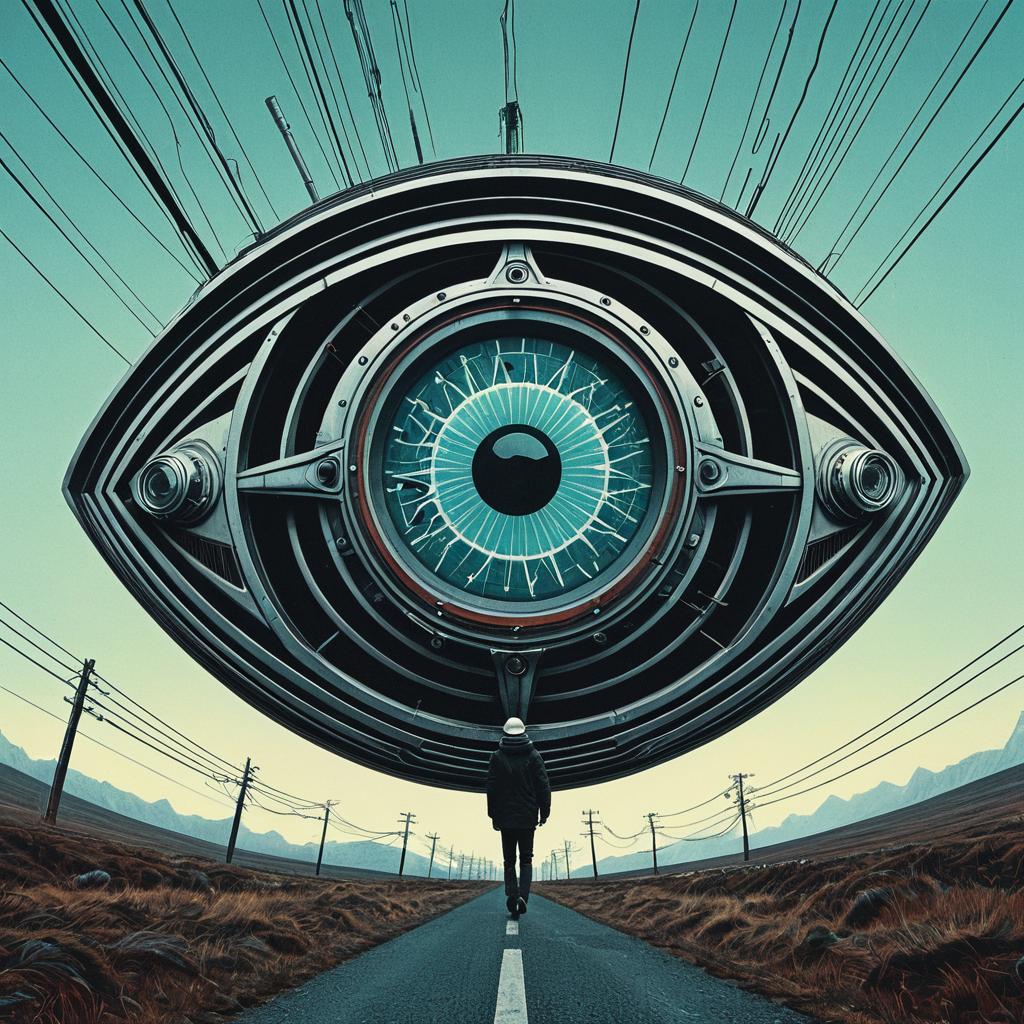 Photorealistic surreal digital artwork featuring a gigantic mechanical eye suspended above a deserted road. A solitary figure in dark clothing and a white hat walks toward the eye, which is highly detailed with metallic components and electric wires extending upward. The landscape is barren with mountains in the background, evoking a retro-futuristic and psychedelic atmosphere.