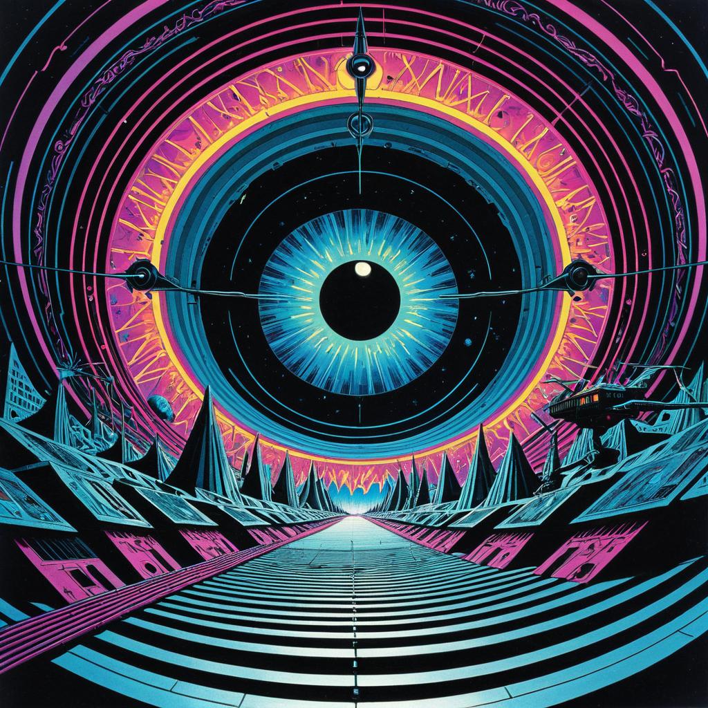 Kinetic Art Simon Stålenhag maniaclelectricfailure/psychedelia 2003 digital LP, in the style of photorealistic surrealism, retro futurism, trompe-l'œil illusionistic detail, Josan Gonzalez, eye-catching composition, extreme angle