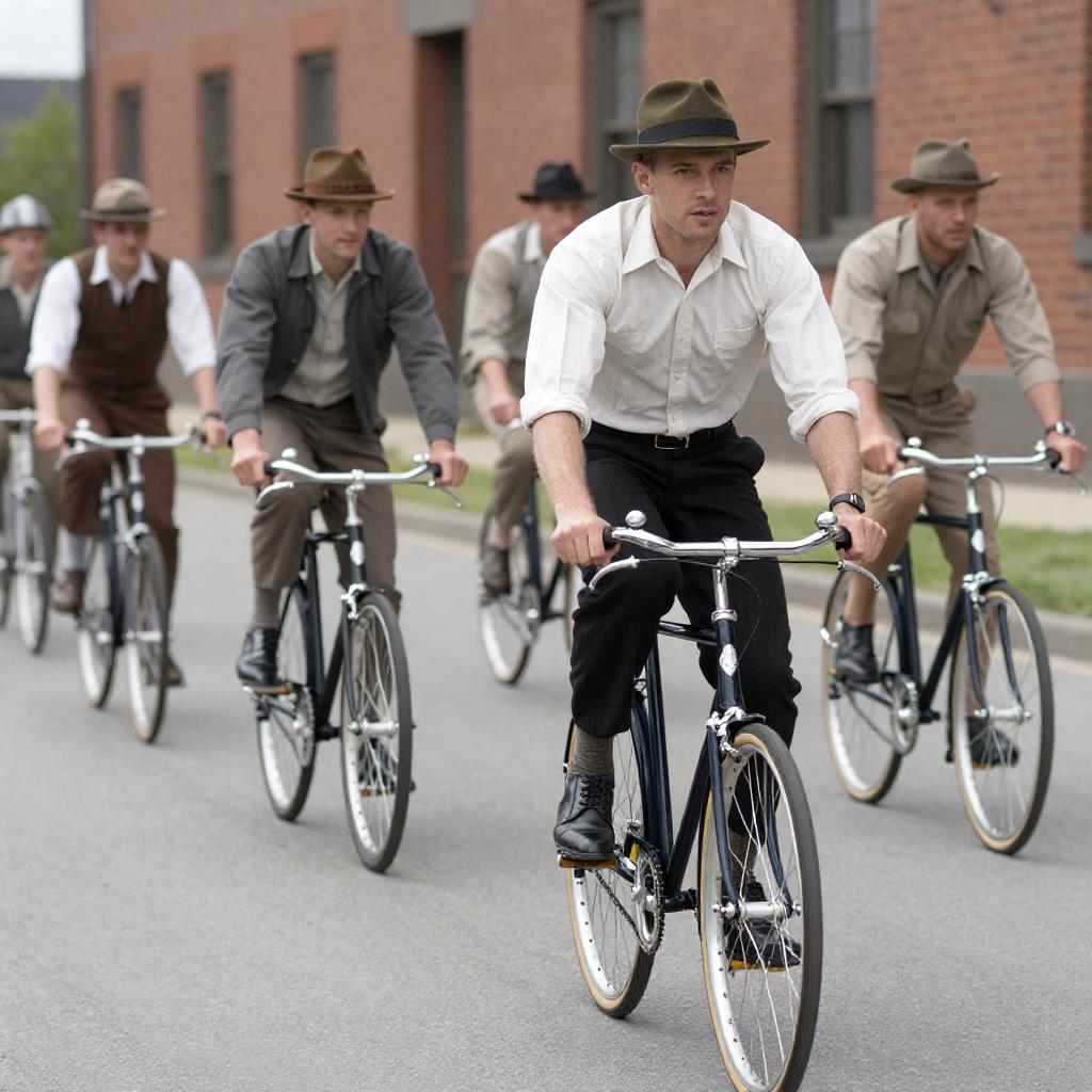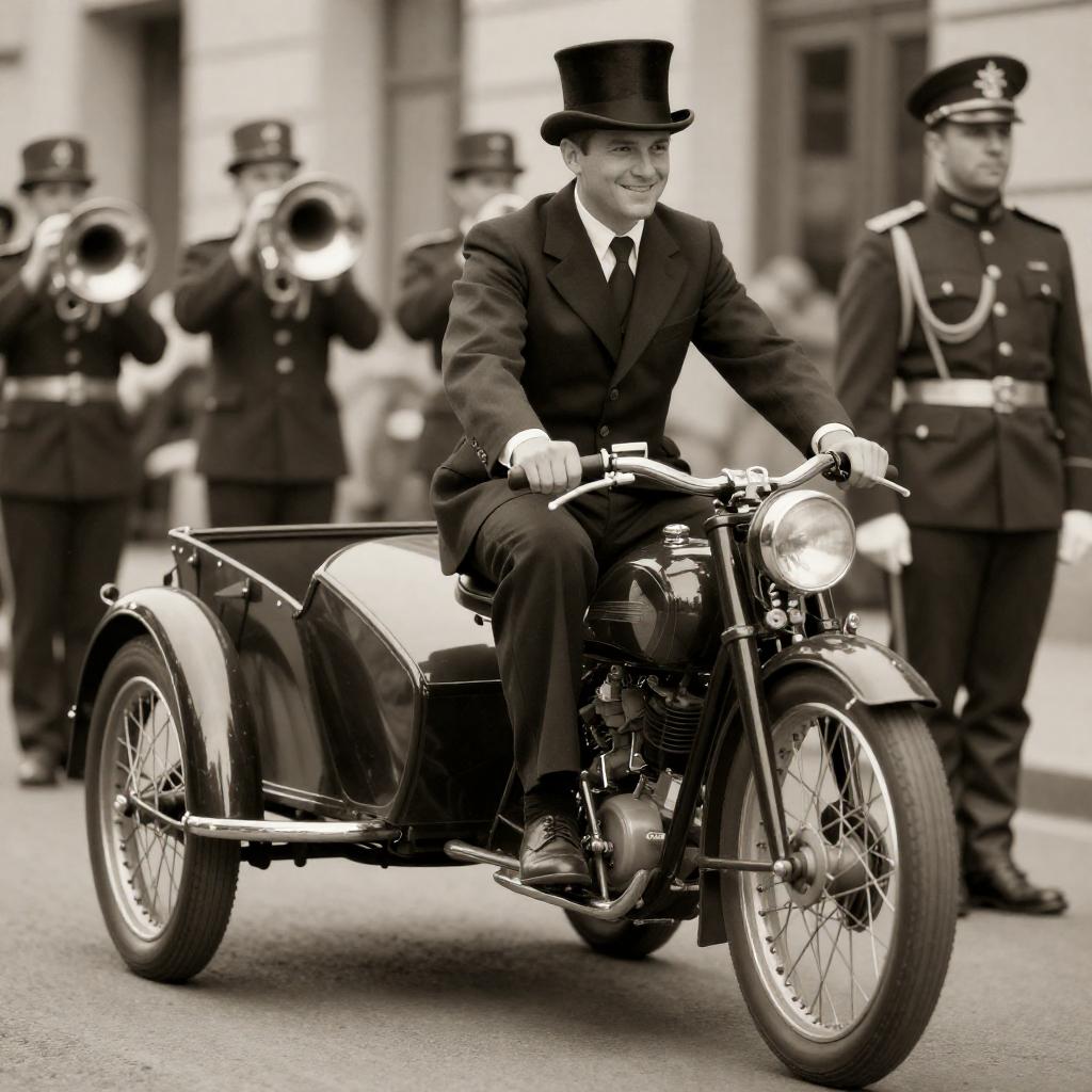 Sepia-toned photograph of a man in a top hat and suit riding a vintage motorcycle sidecar, with brass band instruments visible in the background. The man, smiling, holds the handlebars, while a uniformed soldier stands to the right. The motorcycle has large front and rear wheels, and the sidecar has a simple, open design.