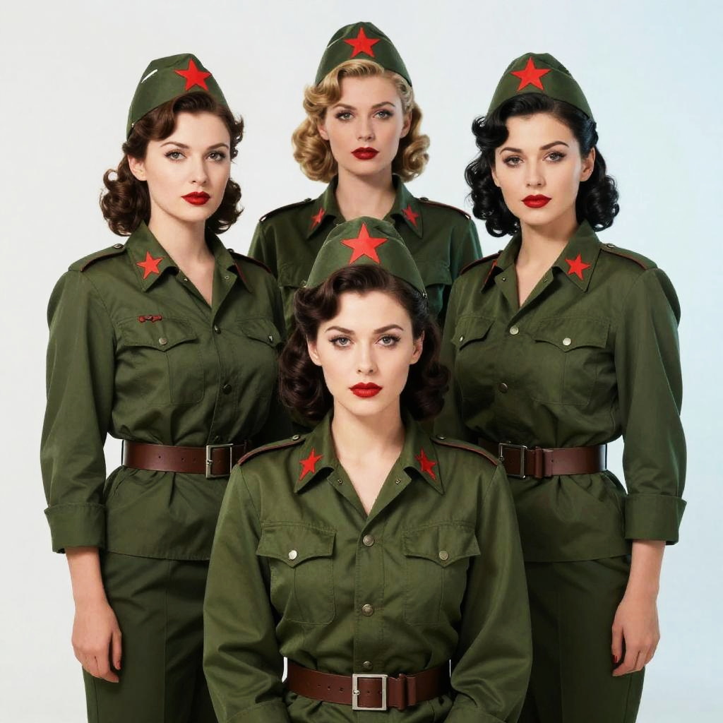 This digitally enhanced image features four women in retro-style, green military uniforms with red stars on their hats and sleeves. They have 1940s-inspired makeup and hairstyles. The woman in the foreground sits with a serious expression, while the others stand confidently behind her. The background is a gradient of white to light blue, adding contrast to their green outfits. The overall style is vintage and slightly exaggerated.