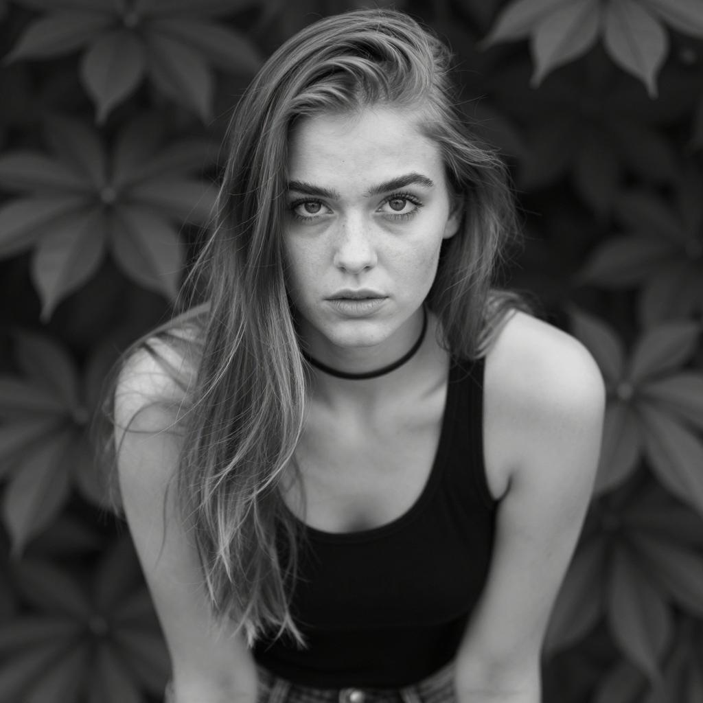 Sepia-toned photograph of a young woman with long, wavy blonde hair, freckles, and light skin. She wears a floral-patterned, high-neck top. Her hair blows gently in the wind. She gazes directly at the camera with a neutral expression. Background is blurred forest. Upper body and face prominently featured.