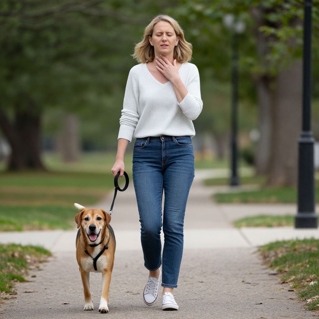 Woman Walking Dog with Sore Throat