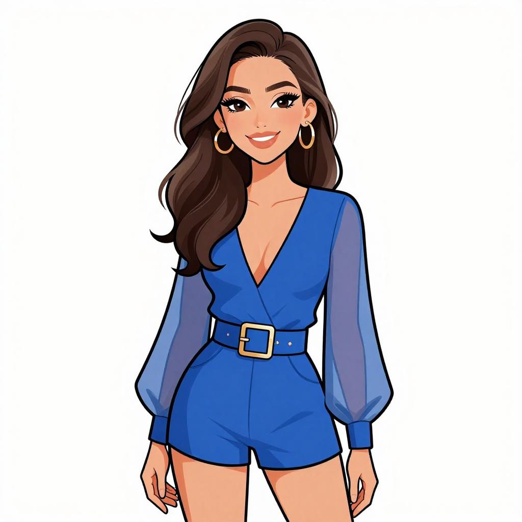 Woman with pretty face and pretty hair. smiling Woman, business casual, royal blue blazer with an open front, cropped at the waist, paired with a black matching crop top and high-waisted pants, fitted silhouette, pants extend to full length. --sref 1467