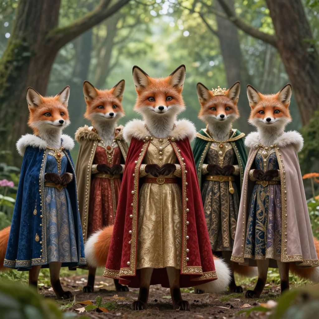 Photorealistic CGI: Five anthropomorphic foxes in medieval royal attire, standing in a sunlit forest, with detailed clothing and regal poses.