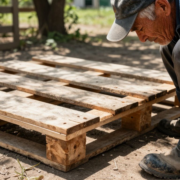 A close-up realistic photograph of a rustic wooden pallet lying on a sunny farmyard floor, with sunlight filtering through the trees in the background, showing the natural wood grain and slight wear on the surface, with a slightly wrinkled farmer's face looking at it from the side, wearing a faded denim hat and muddy boots.