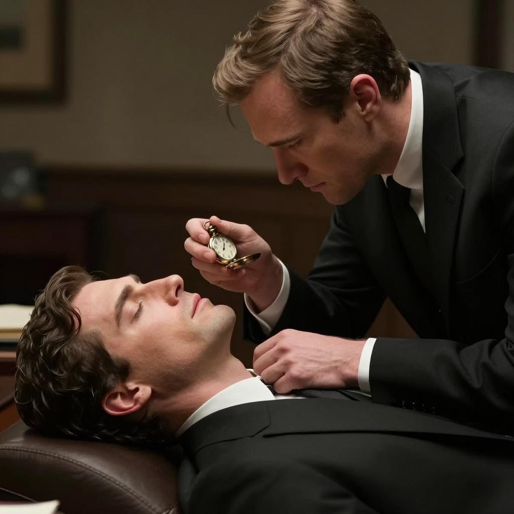 A photograph of a man in a black suit and white shirt holding a pocket watch over the face of a man lying down. The lying man has short dark hair, closed eyes, and a neutral expression. The man in the suit has light brown hair, a focused expression, and is wearing a black jacket. The background is dark and blurred. The man in the suit is positioned on the right, while the man lying down is on the left. Both men are in the foreground.