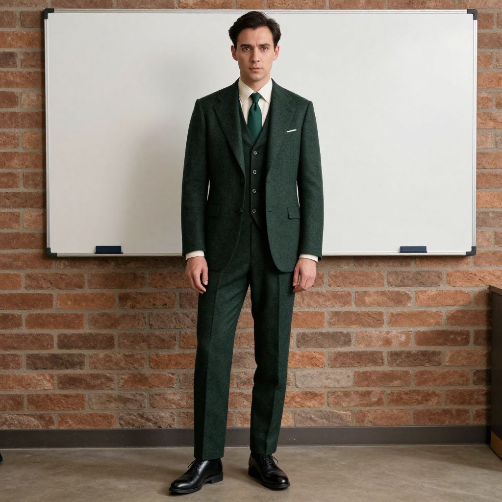 Photograph of a young Caucasian man with short dark brown hair, standing in front of a large whiteboard mounted on a red brick wall. He is wearing a dark green, three-piece suit with a white dress shirt and a matching green tie. His black leather shoes are polished and shiny. The man has a serious expression, standing with his arms slightly relaxed by his sides. The whiteboard behind him is blank, with two small black square markers visible at the bottom corners. The lighting is even, highlighting the textures of the brick wall and the formal attire.