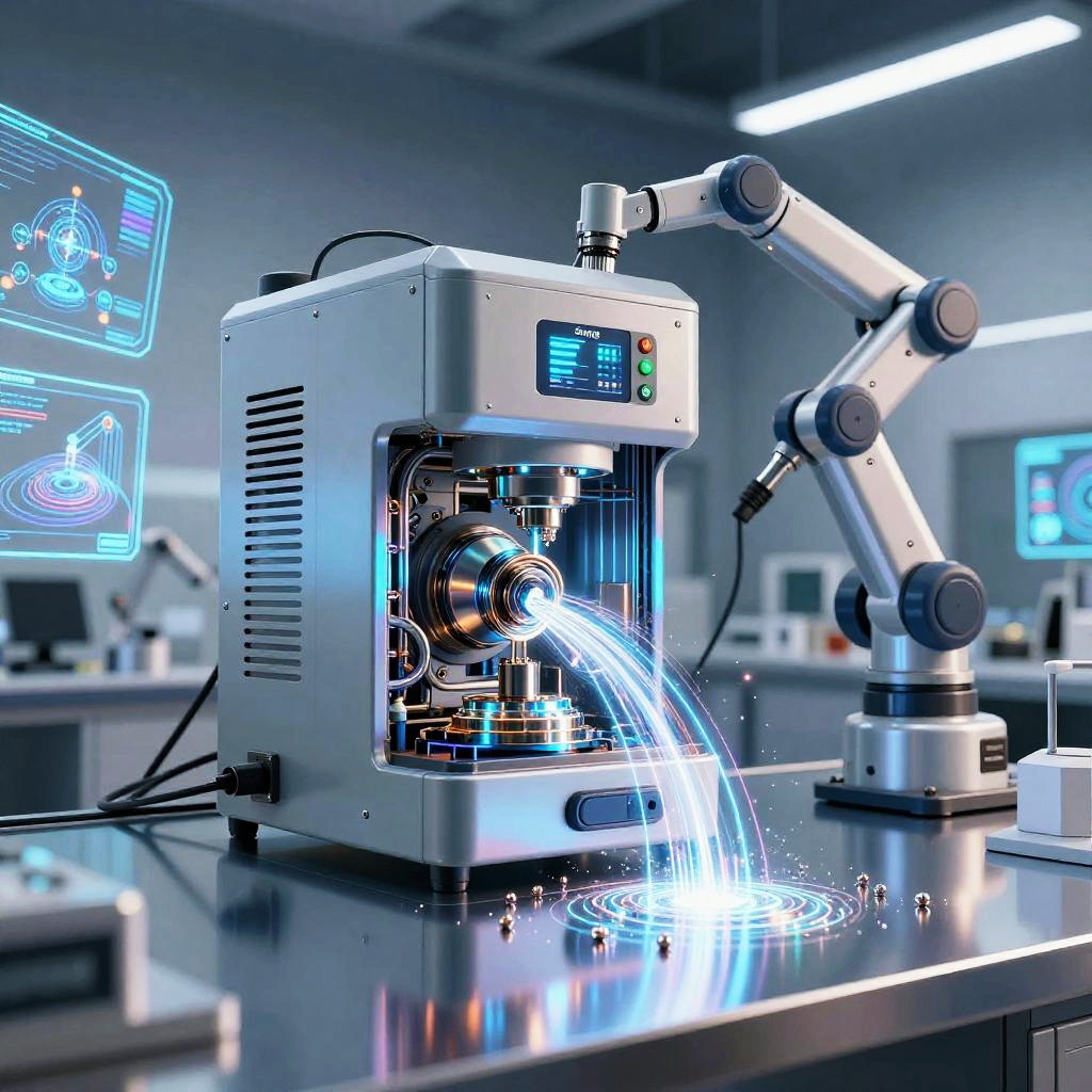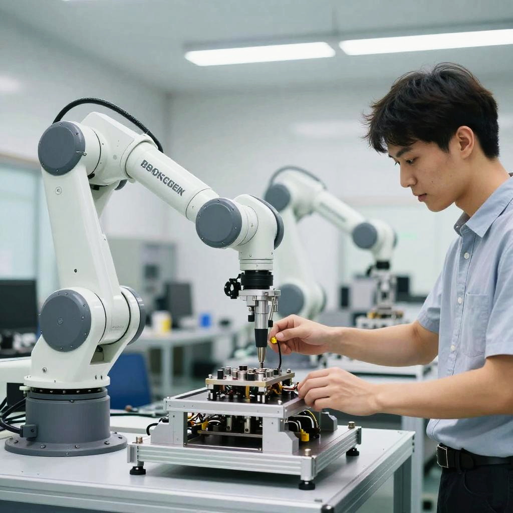 Assisted intelligence illustrated as a collaborative robot and human workspace, with robotic arms and human hands jointly assembling complex machinery, bright modern industrial environment, emphasis on cooperation and technology enhancing human abilities, realistic lighting
