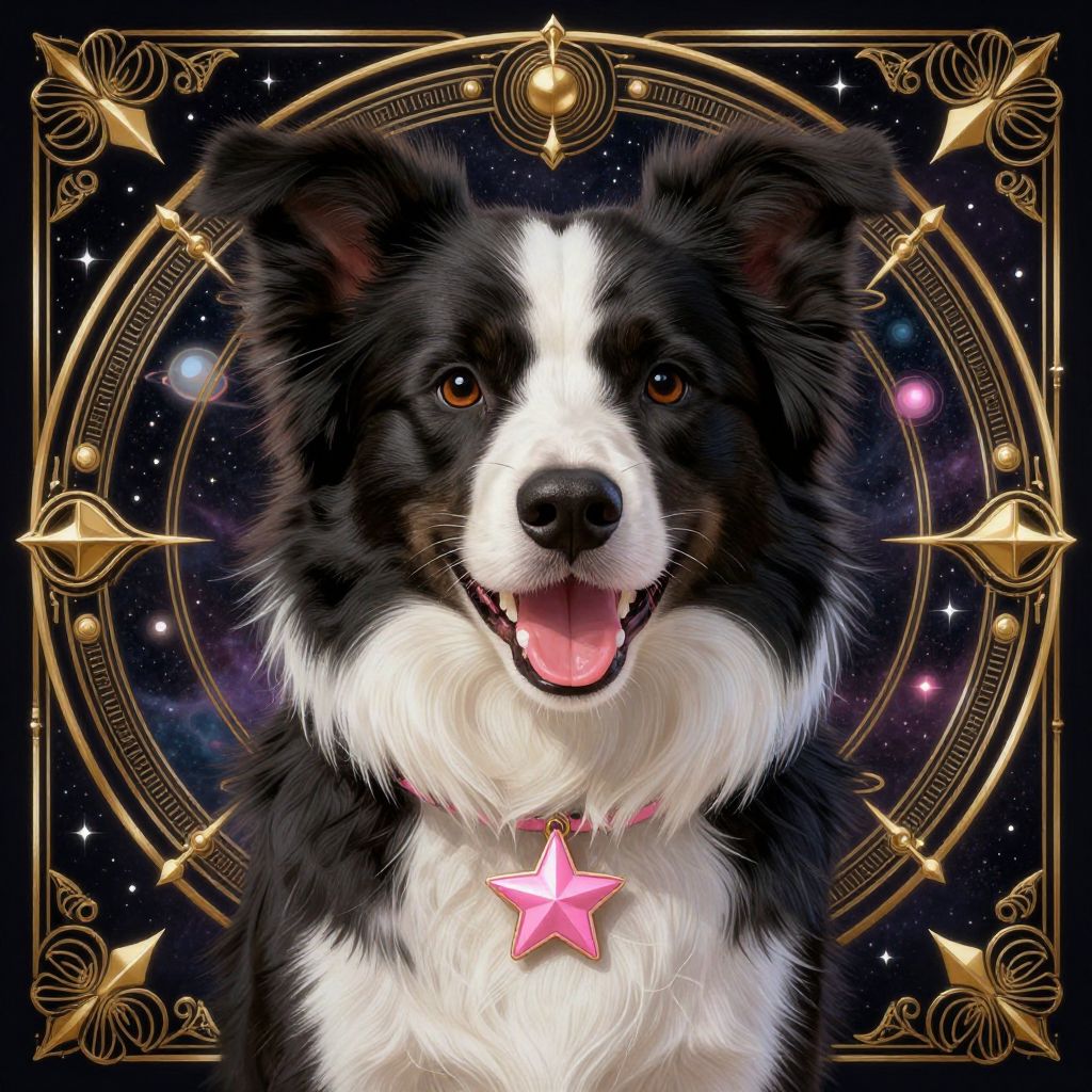 A smiling border collie dog with a pink star on its collar, outer space, fantasy, intricate, elegant, highly detailed, digital painting, artstation, concept art, smooth, sharp focus, illustration