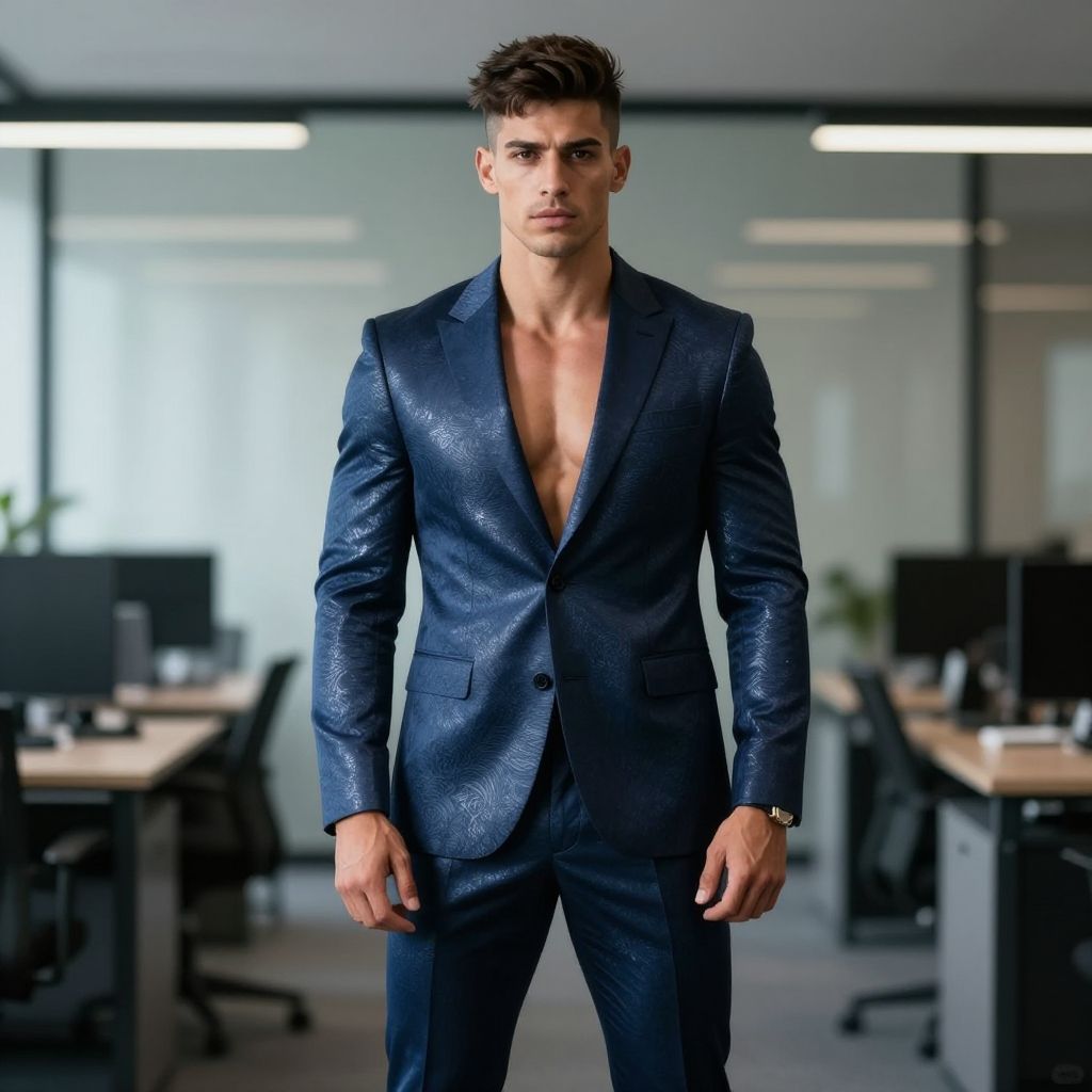 Photograph of a tall, muscular man with short, dark brown hair and a serious expression. He is wearing a dark blue, shimmering, single-button suit with the top button undone, revealing his chest. His skin is fair, and he has a clean-shaven face. He stands in a modern office with blurred desks and computers in the background, under bright fluorescent lights. The office has large windows letting in natural light and a few potted plants are visible. The overall style is sharp and professional with a touch of edginess.