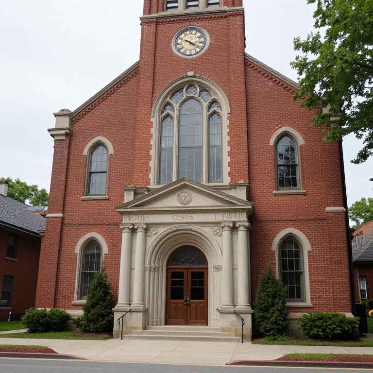 Photograph of a red-brick Gothic-style church with tall arched windows, a large clock above the entrance, and ornate stone detailing. Two