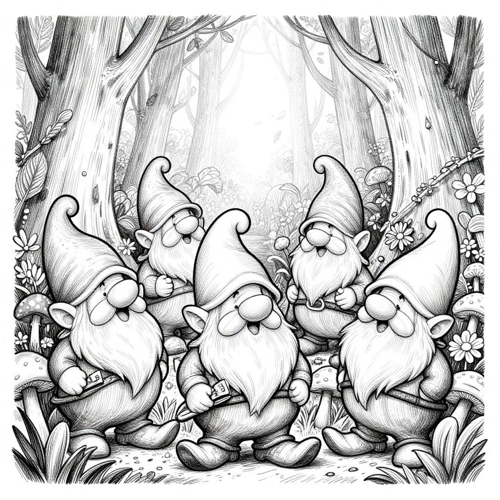 Black-and-white digital drawing of five whimsical garden gnomes with pointy hats, bushy beards, and round glasses, clustered together in a forest setting. The gnomes, with small, chubby bodies and stubby arms, are surrounded by detailed foliage, including mushrooms, flowers, and leaves. The background features tall, curving tree trunks with textured bark. The image uses bold, cross-hatched lines and has a playful, cartoonish style. The gnomes' expressions are cheerful, and they appear to be engaged in a conversation or sharing a moment. The overall mood is whimsical and magical.