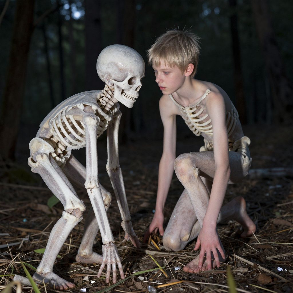 Photograph of a young, fair-skinned boy with short blonde hair, crouching in a dark forest. He is wearing a skeletal costume, including a skeleton mask, shirt, and pants, revealing his pale, skeletal frame beneath. He is intently looking at a white, full-body skeleton standing on its hands and knees in front of him. The forest floor is covered with dry leaves and twigs, and the background is dimly lit, with tall, shadowy trees. The scene has a eerie, Halloween atmosphere, with a focus on the boy's fascinated expression and the contrast between his costume and the real skeleton.
