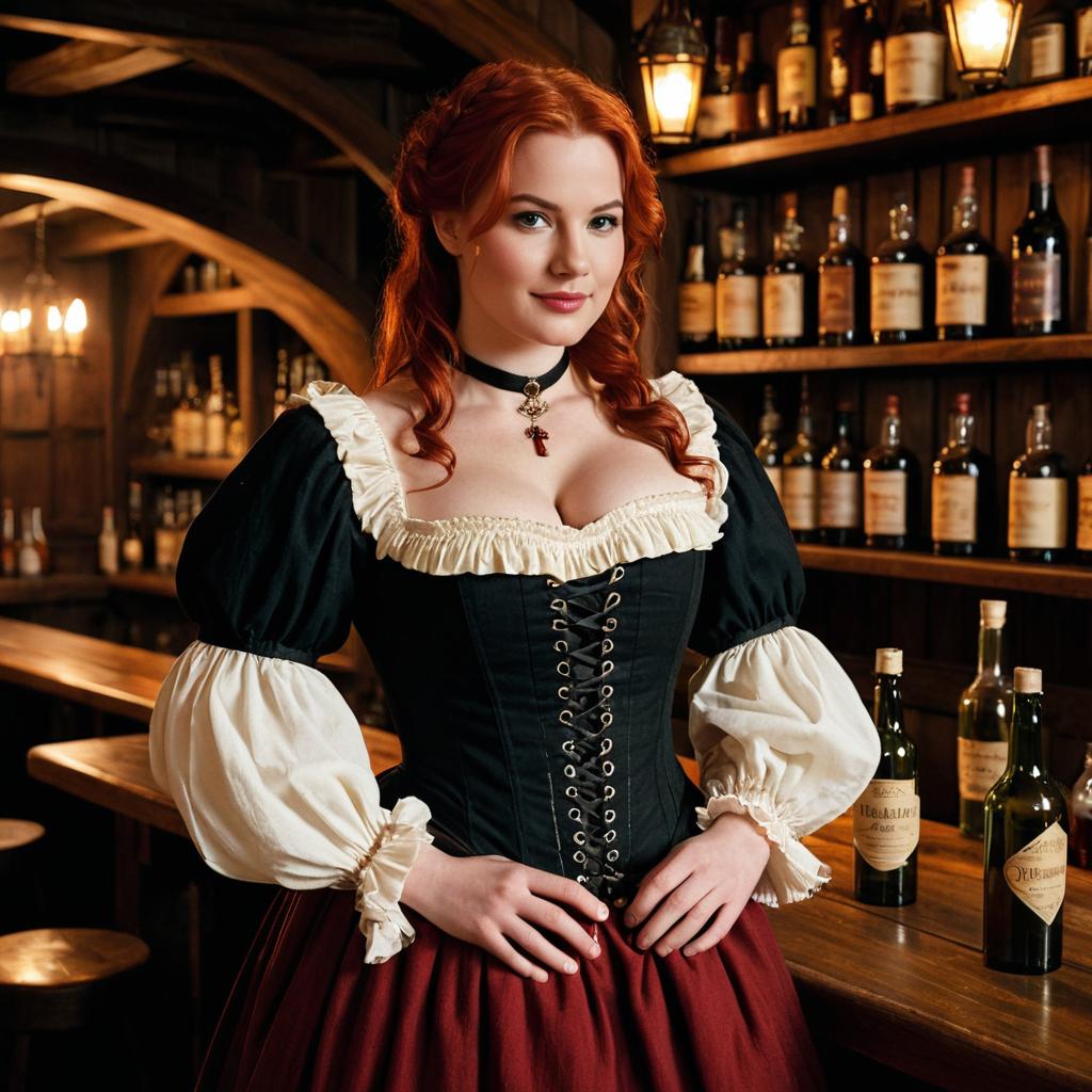 Renaissance bar maid costume, photo of a redheaded woman in a medieval-style dress, standing in a dimly lit tavern, wearing a corset with lacing, puffed sleeves, cream ruffled cuffs, black bodice, red and brown skirt, choker necklace, wooden bar in background, shelves filled with bottles, warm lighting, realistic, detailed, period costume, film-like quality, slight smile, fair skin, standing with hands resting on bar, realistic ures, tavern setting, 17th century attire