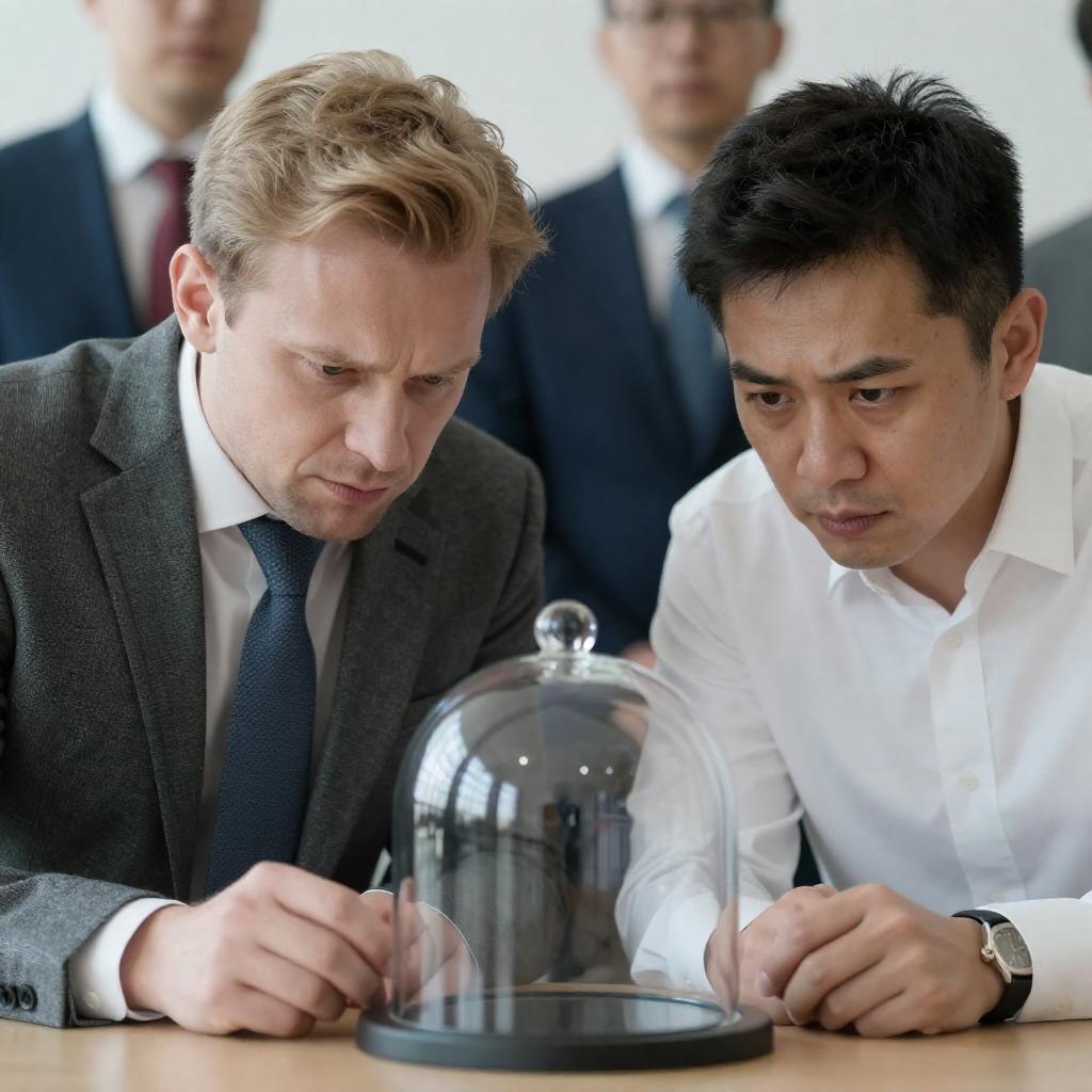 Photograph of two men with intense expressions, one with blond hair in a gray suit, the other with dark hair in a white shirt, examining a glass dome on a wooden table. Background is blurred. Two people.