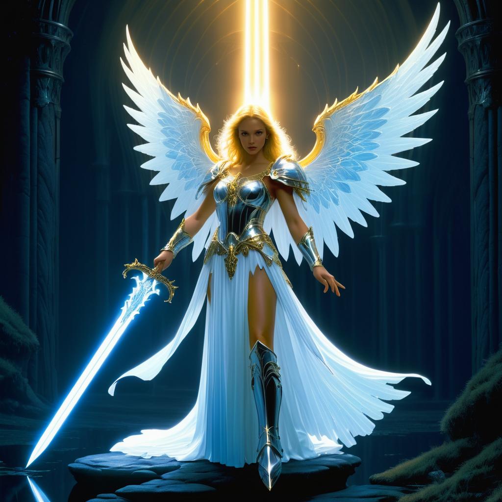 Beautiful angel with radiant wings holding a glowing sword, set in a dark fantasy world. Styled in high detail by Michael Whelan.