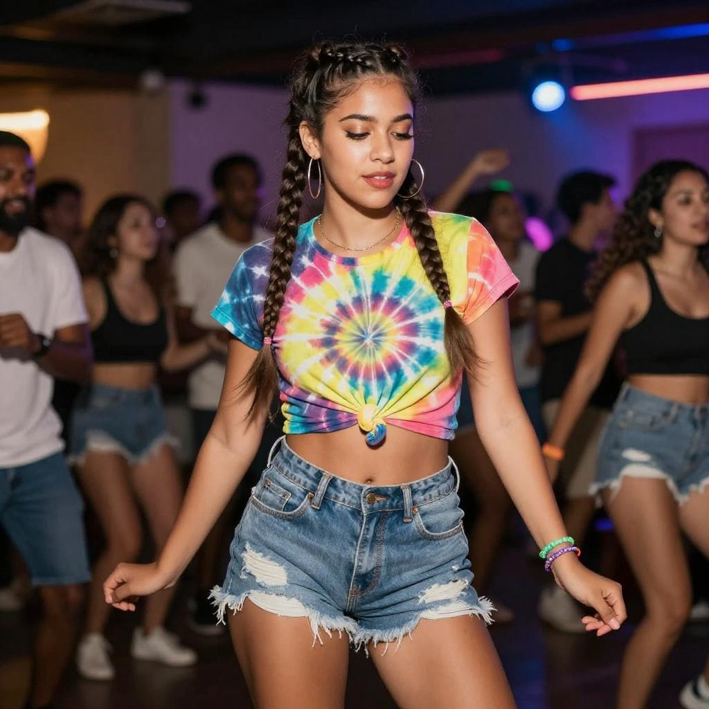 A vibrant dance scene featuring a woman with braided hair, exuding confidence and energy. She wears a colorful tie-dye crop top and denim shorts, perfectly embodying the lively atmosphere of a night out. The background showcases dynamic lighting and silhouettes of others enjoying the moment, enhancing the festive mood.