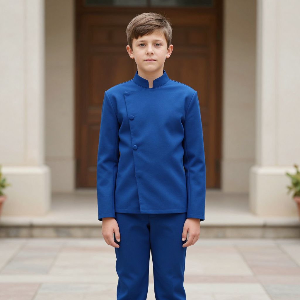 Royal Blue Costume, young boy in blue uniform standing in front of a building