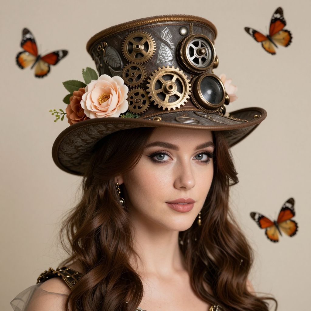 A woman in a detailed steampunk hat adorned with gears and flowers, surrounded by butterflies.