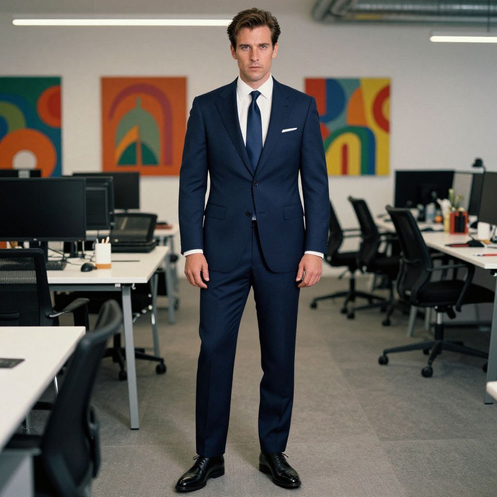 A man, navy blue tailored fit suit, crisp white dress shirt, silk navy tie, polished black leather oxford shoes, modern workspace, open-plan design, vibrant artwork on walls, chromogenic film style, confident expression Man has masculine face and piercing eyes