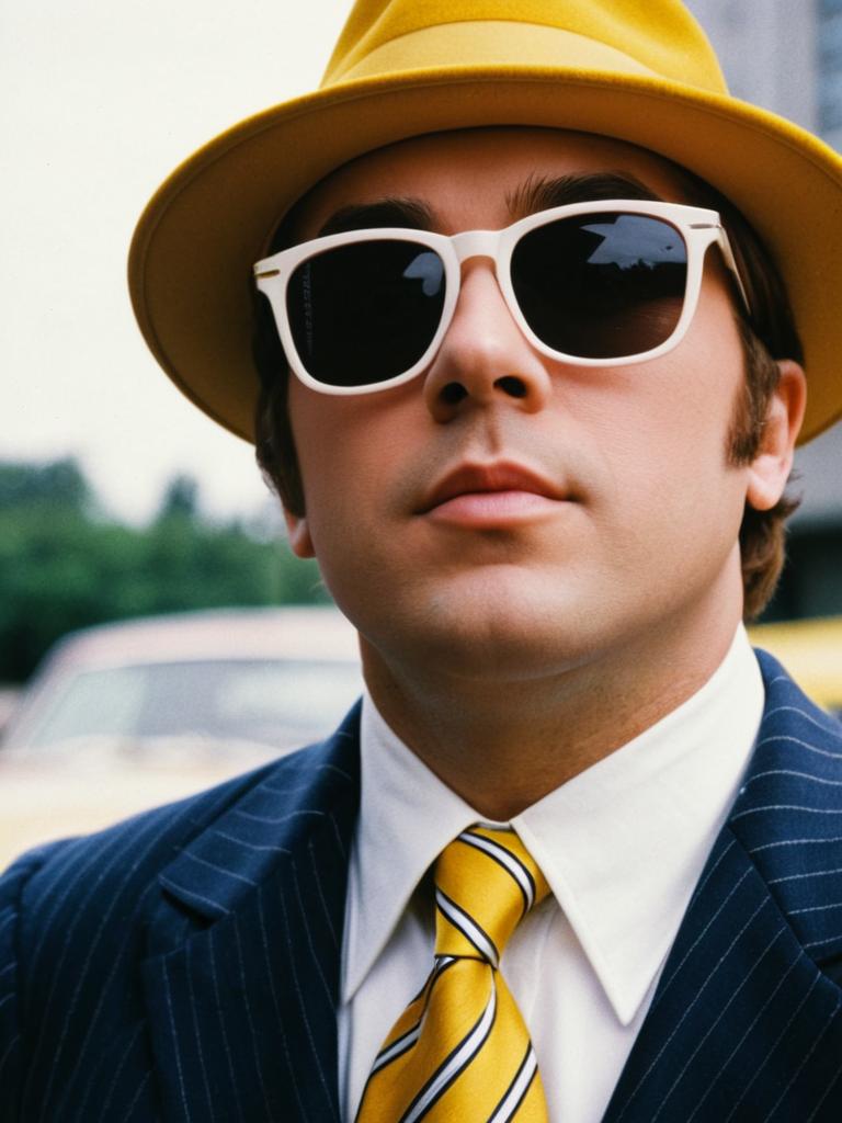 Austin powers goldmember, 1boy, male focus, sunglasses, necktie, hat, yellow necktie, shirt, suit, jacket, solo, formal, upper body, white shirt, blurry, blurry background, closed mouth, realistic