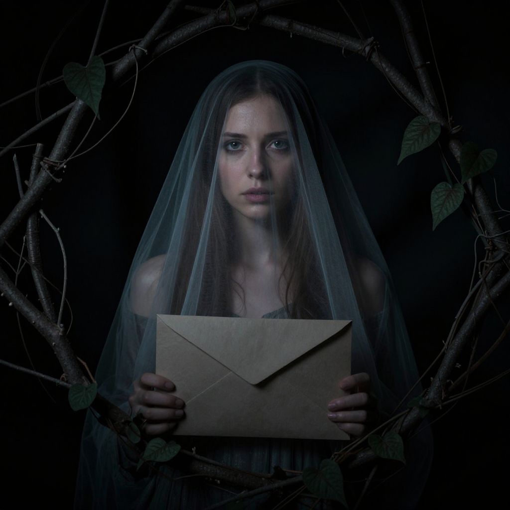 Enveloped by a ring of creeping shadows, the woman stands as a paradox of vulnerability and resilience, her gaze piercing through the veil of mystery and foreboding, evoking a haunting blend of introspection and existential unease.