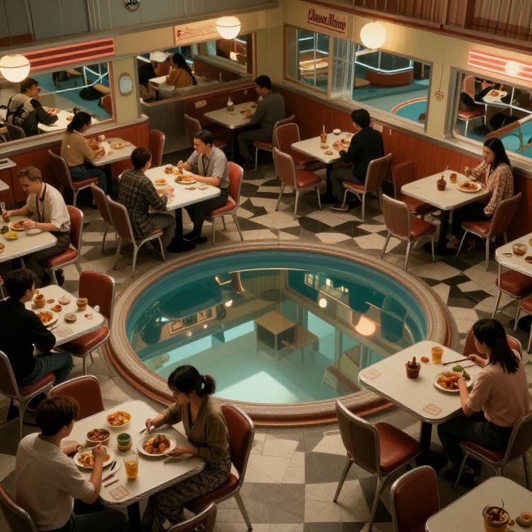 Create an image depicting a surreal diner interior, blending impossible architectures with nostalgic Americana. Inside this dream-like setting, tabletops appear to tilt into infinity, their reflections shimmering on the mirrorlike surface of a nearby pool encircled by mismatched chairs. This scene should be captured from a high-angle perspective, offering a labyrinthine view of tables and chairs that evoke intrigue and disorientation as one navigates through the maze-like environment. Soft, warm lighting casts gentle shadows across patrons' faces, some deeply absorbed in their meals while others seem captivated by the endless reflections surrounding them, creating an emotional spectrum ranging from comforting familiarity to unsettling uncertainty.