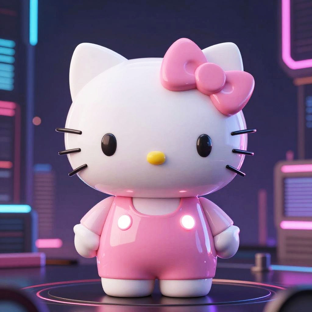 3D CGI image of Hello Kitty with a pink bow, pink dress, and white face, standing in a neon-lit futuristic cityscape.