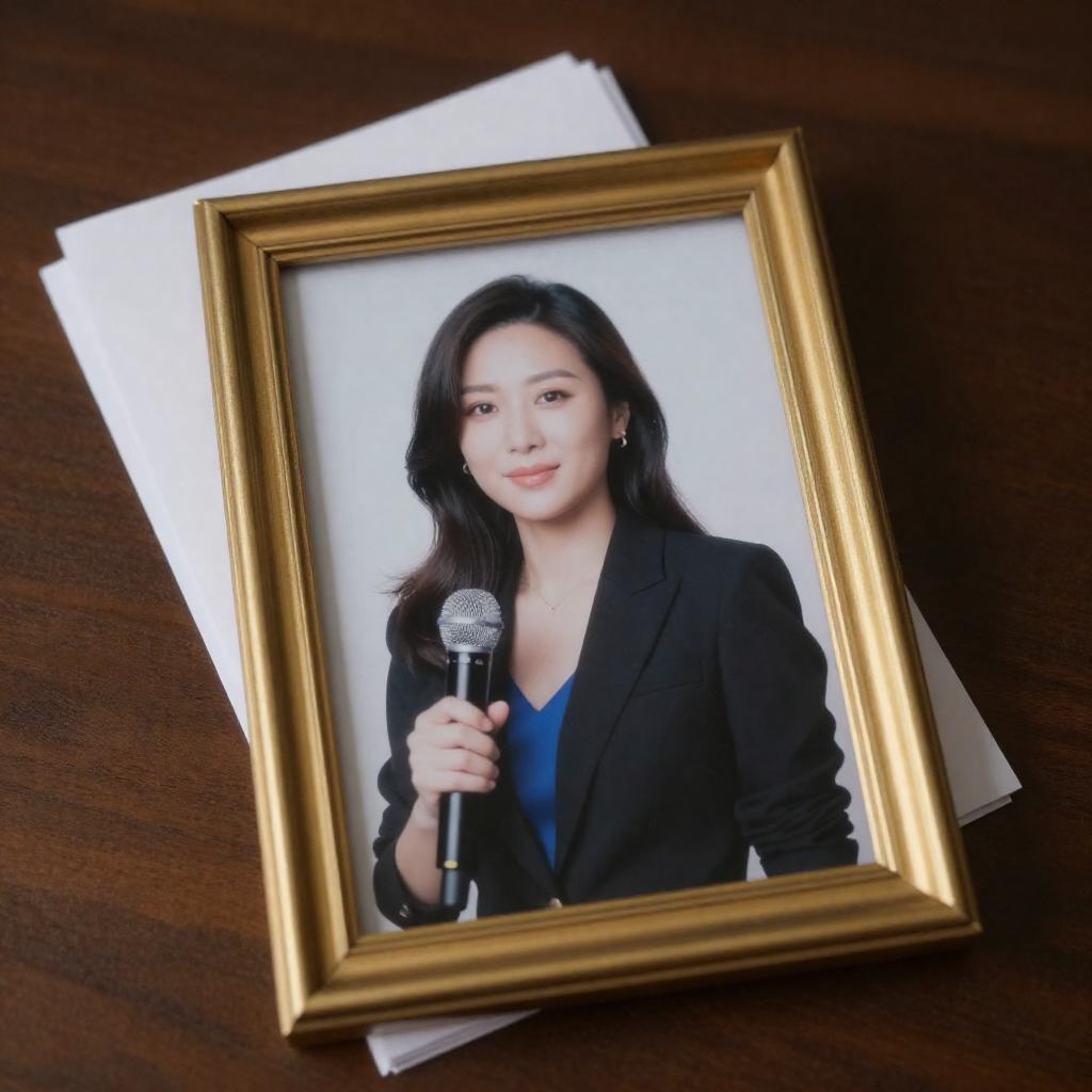 Photograph of a framed portrait on a dark wooden desk. The portrait shows a woman with dark hair, wearing a black blazer over a blue top, holding a microphone. Several white papers are stacked behind the frame. The frame is gold with a thin border. The woman has a calm expression. The photograph is slightly tilted.