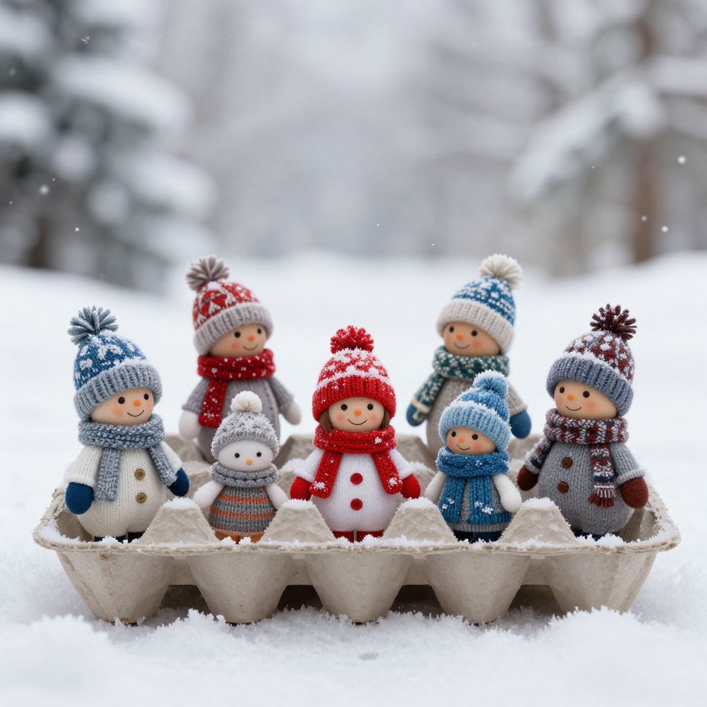 Cozy winter serenity unfolds in a whimsical egg carton scene, where snow-dusted figures in vibrant knitwear evoke warmth, playfulness, and the enduring magic of childhood wonder amidst the crisp embrace of winter.