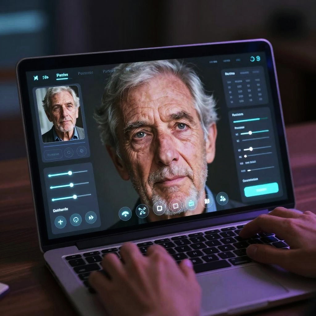 Remove wrinkles photo online free, a futuristic digital art showcasing an open web app softly erasing wrinkles from an elderly face, interface filled with glowing buttons and sliders, ambient neon reflections on user’s hands, cyberpunk-inspired background with subdued tones.