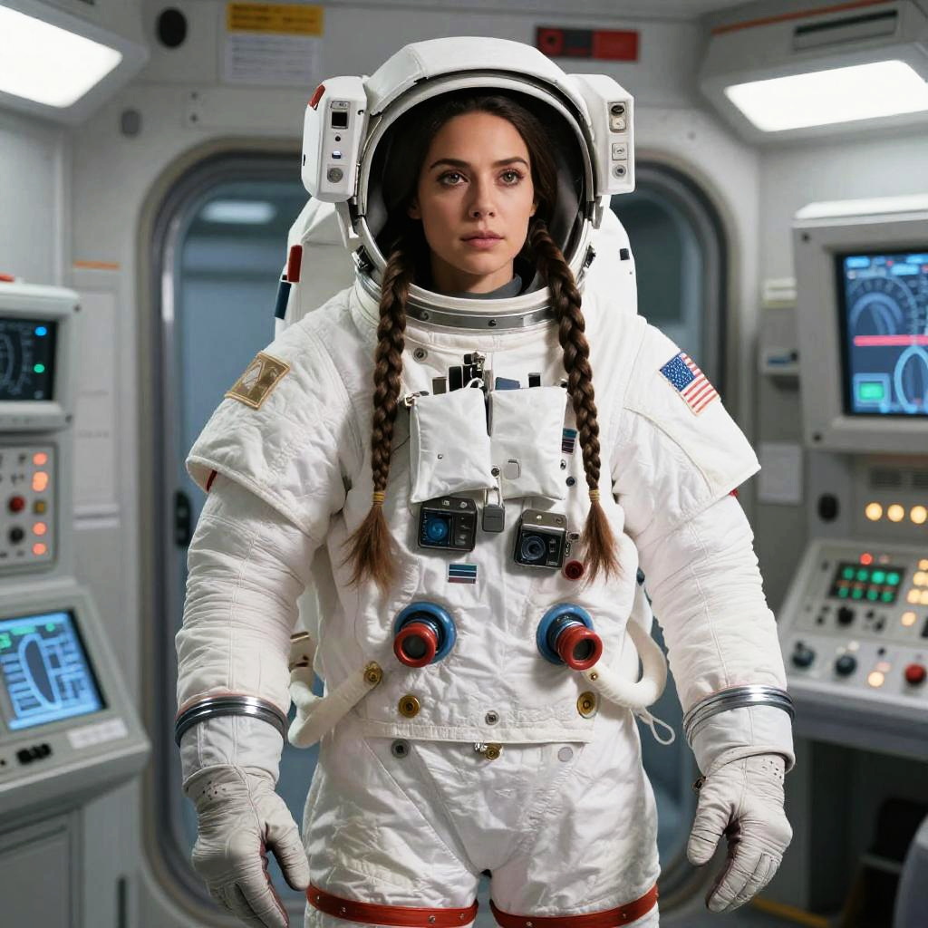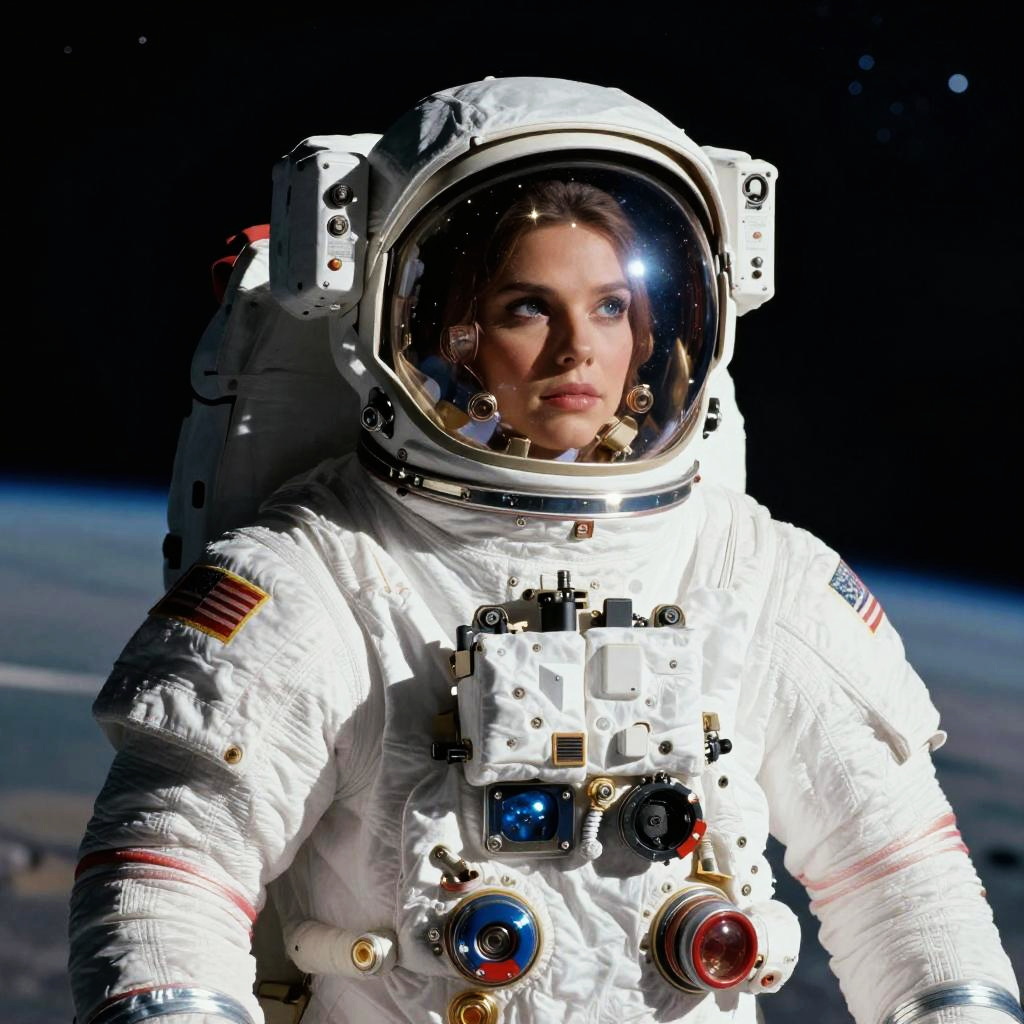 Portrait of a female astronaut wearing a detailed white space suit and helmet, set against a vivid star-filled cosmic background. The astronaut has light skin and light brown hair, and is looking slightly to the side with a calm and focused expression. The image features intricate details on the suit and a realistic depiction of outer space stars and celestial elements.