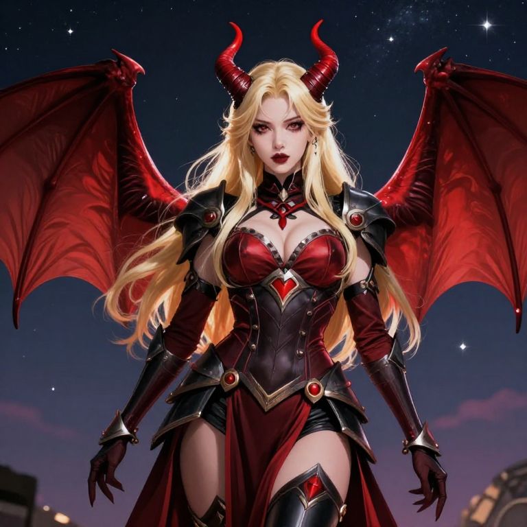 Digital art of a blonde demon woman with red wings, black and red armor, horns, and a starry night sky background.