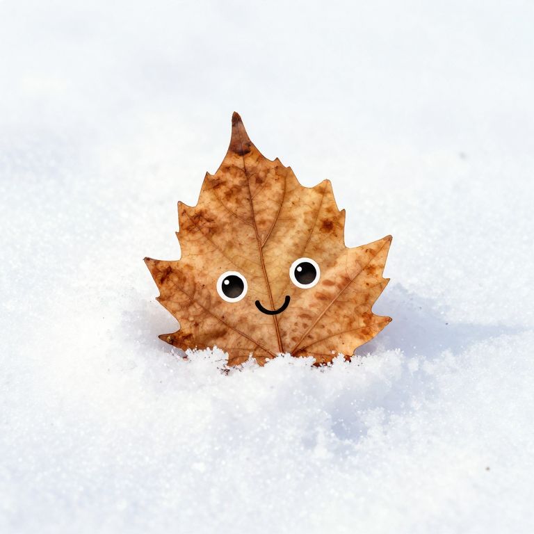 Digital artwork of a brown, autumn leaf with a happy, smiling face, featuring large black eyes and a small, curved black mouth. The leaf has a textured, slightly speckled surface and is positioned in the center of a white background with a small patch of snow at the bottom, giving a contrast between the warm brown of the leaf and the cool white of the snow. The leaf's edges are slightly curled, and its veins are subtly visible, adding to the realistic texture. The style is cute and whimsical.