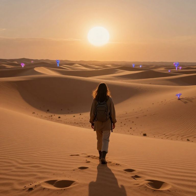 Lika exploring an alien desert landscape, under twin suns casting long shadows on endless dunes, strange bioluminescent plants dotting the horizon, her outfit blending with environment colors, mysterious and adventurous mood, highly detailed concept art