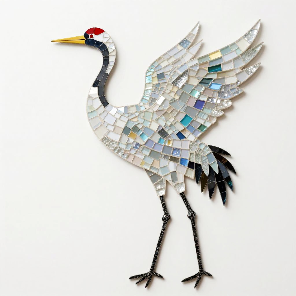 A detailed digital artwork featuring a graceful crane composed of a mosaic of small, colorful glass pieces that form a fragmented, pixelated effect. The subject is portrayed in a minimalist style, with carefully arranged blocks creating depth and definition. The color palette is vibrant, including shades of white, soft gray, silver, pastels that reflect light, giving the artwork a luminous quality.