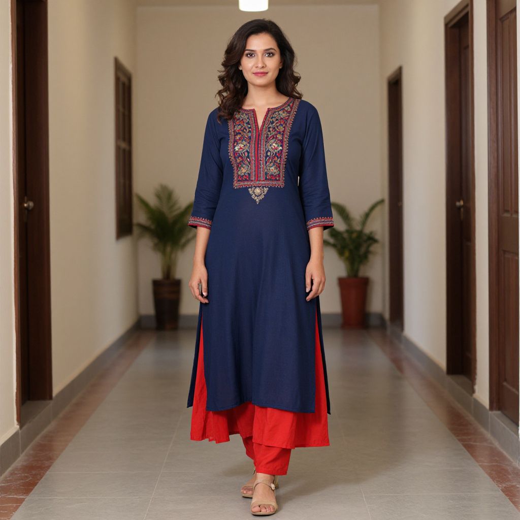 Shirt Style Kurta Woman Costume, a woman standing in a hallway wearing a blue and red dress