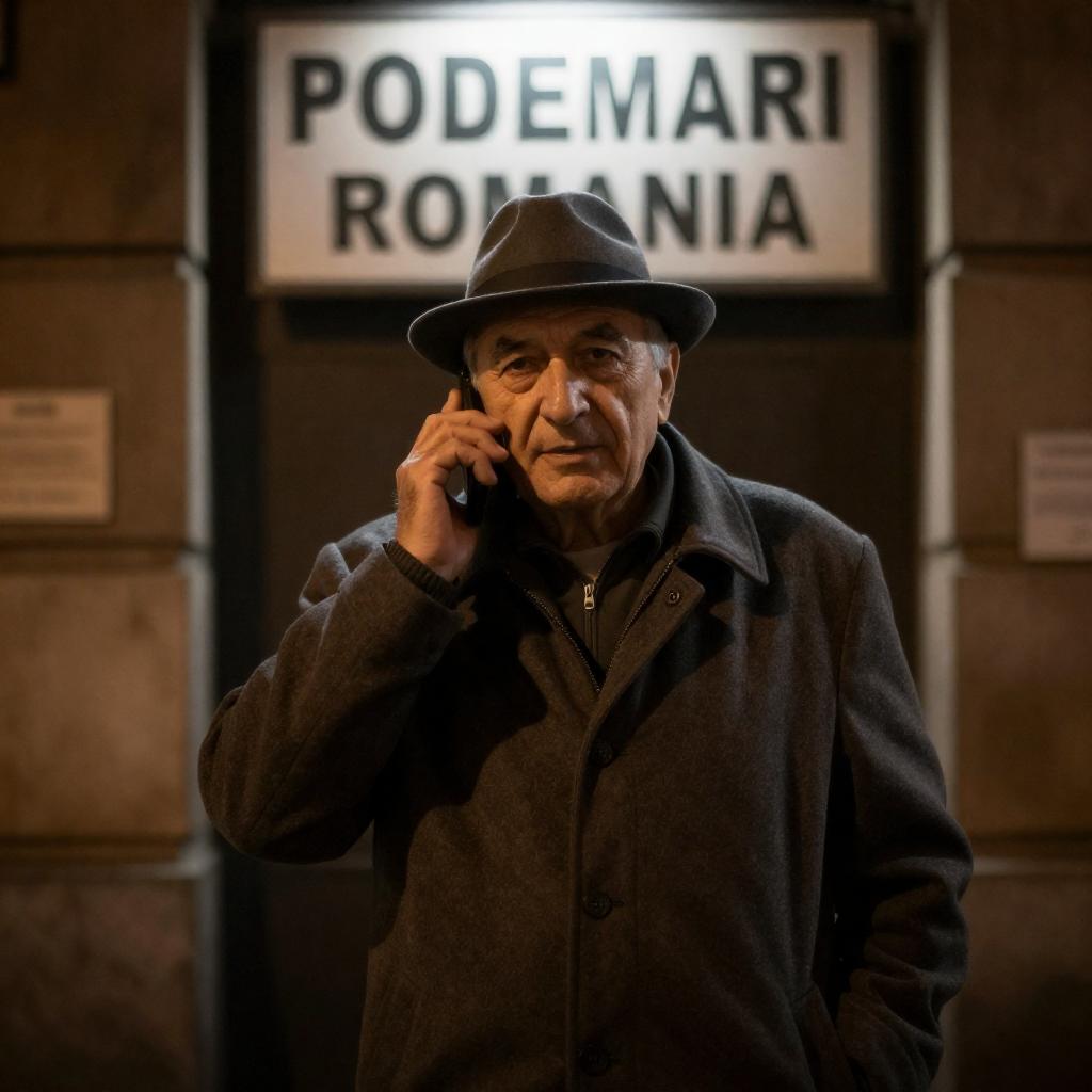 Photograph of an older man with a grey hat and coat, standing in a dimly lit alley, talking on a phone. He has a focused expression. Behind him, a sign reads "PODEMARI ROMANIA". The background is dark and ured. The man is in the center, illuminated by light from above.