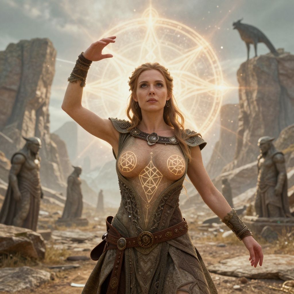 OverallDetail, fFaceDetail, EyeDetail, (clothed, masterpiece, wide angle, cinematic establishing shot, young adult european woman, highly detailed background:1.2), volumetric lighting, subsurface scattering, dynamic pose, (special effects, color grading, fantasy aura), (Elemental Geomancer:1.4), (Medium Covered breasts:0.81), Rock formations, earthy robes, geomantic symbols, stone guardians