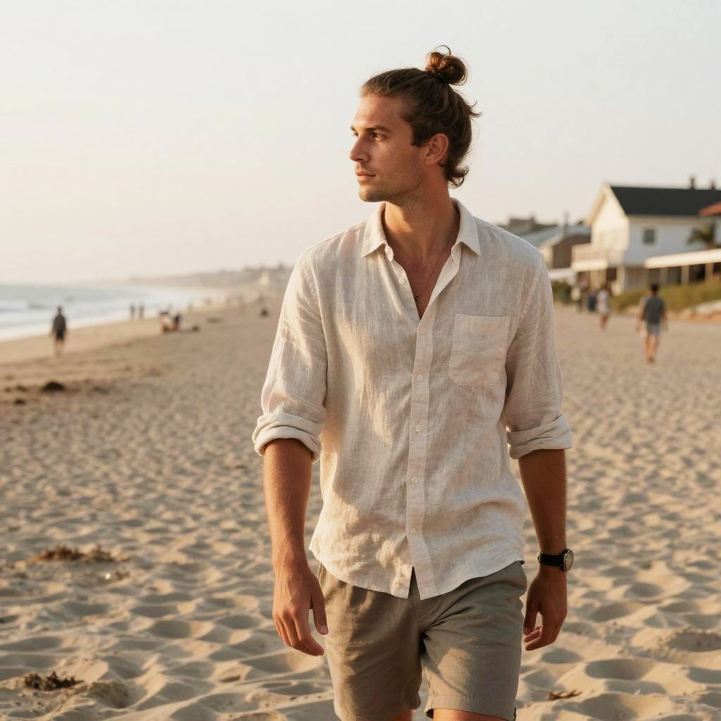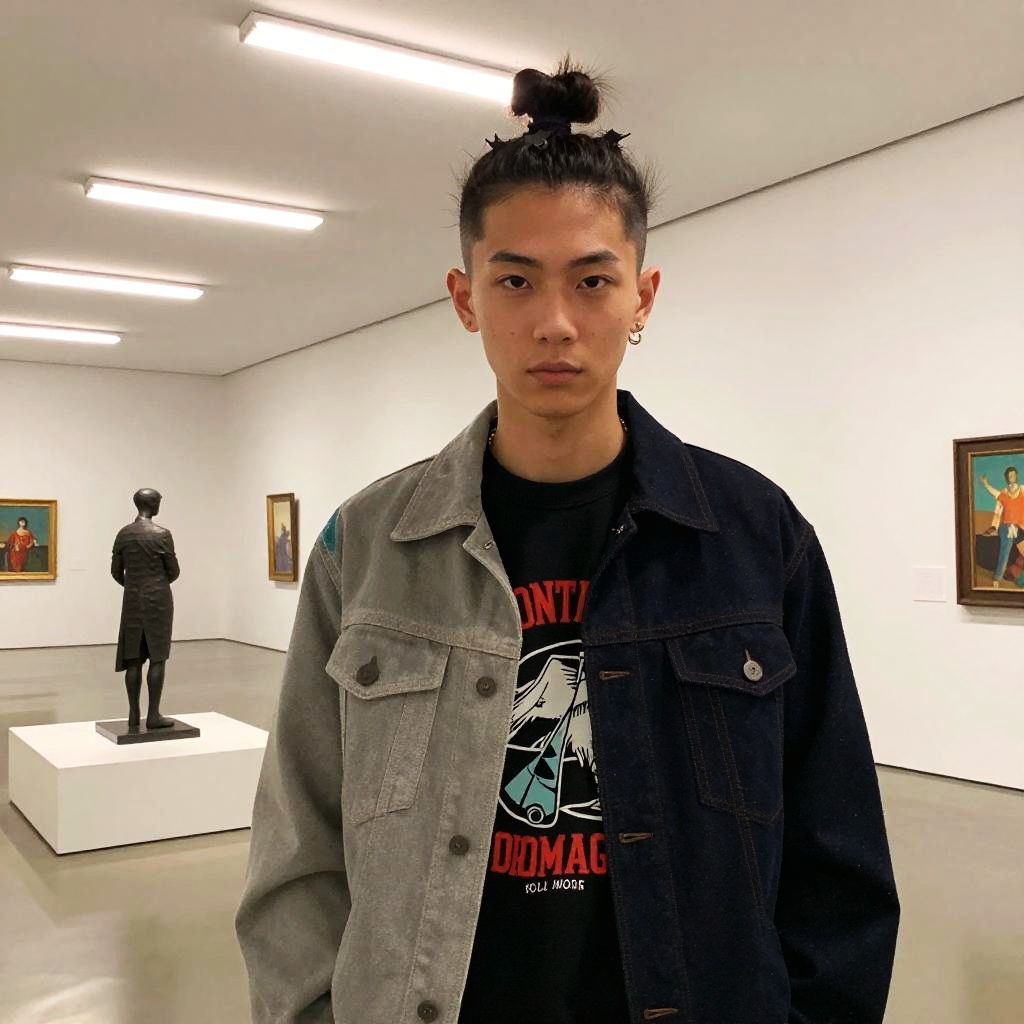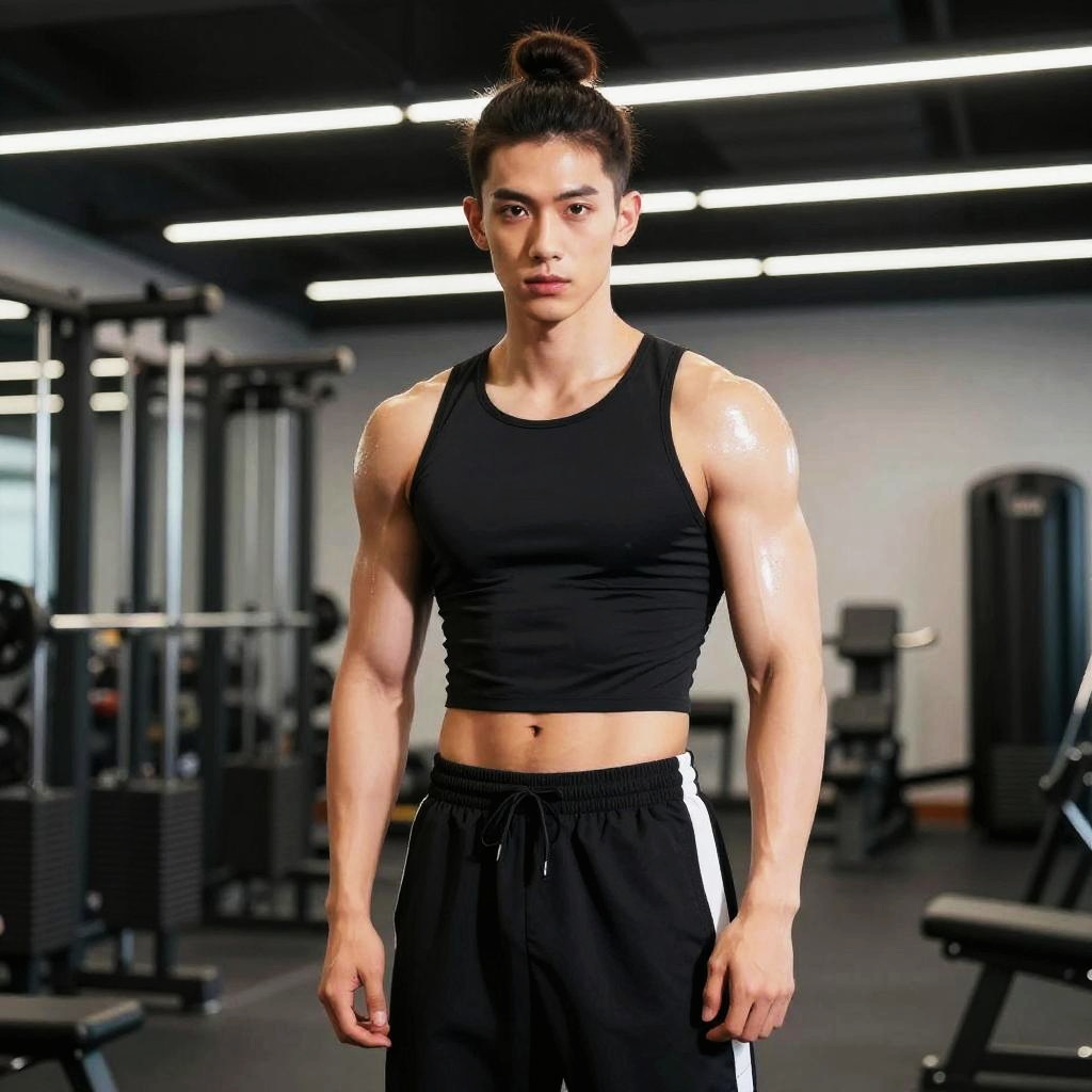 Disconnected Top Knot hairstyle on male model, wearing sporty crop top and track pants, in modern gym studio, captured in fashion editorial style with glossy tone.